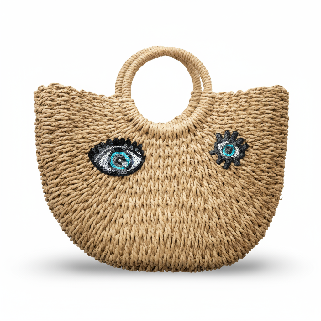 The Goldilocks of beach bags—not too big, not too small, just right. The Abigail Evil Eye Beach Bag hits the sweet spot at 25 x 37 cm, offering generous capacity without the bulk of oversized totes. Woven from natural straw and embellished with captivating sequins that form the evil eye design, this bag combines artisan craftsmanship with meaningful symbolism believed to deflect negativity while inviting good fortune.