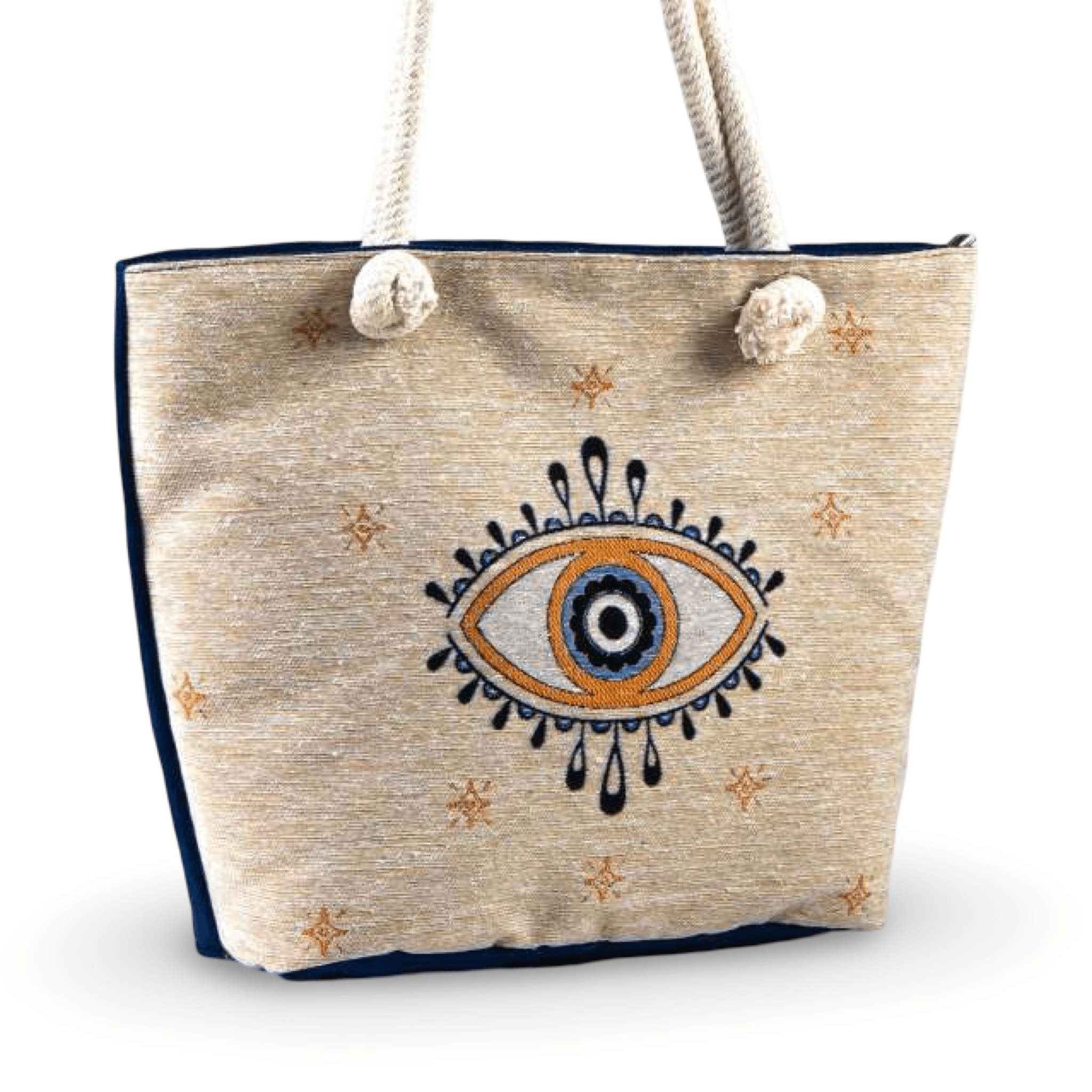 Make a bold statement with the Aisha Evil Eye Canvas Beach Bag, where vibrant artistic expression meets protective tradition in a celebration of color and positive energy. Named to honor the spirited essence of Mediterranean beach culture—where music drifts from seaside tavernas, laughter echoes across sun-warmed sand, and every day feels like a festival—this tote brings joyful vibes to your coastal adventures.