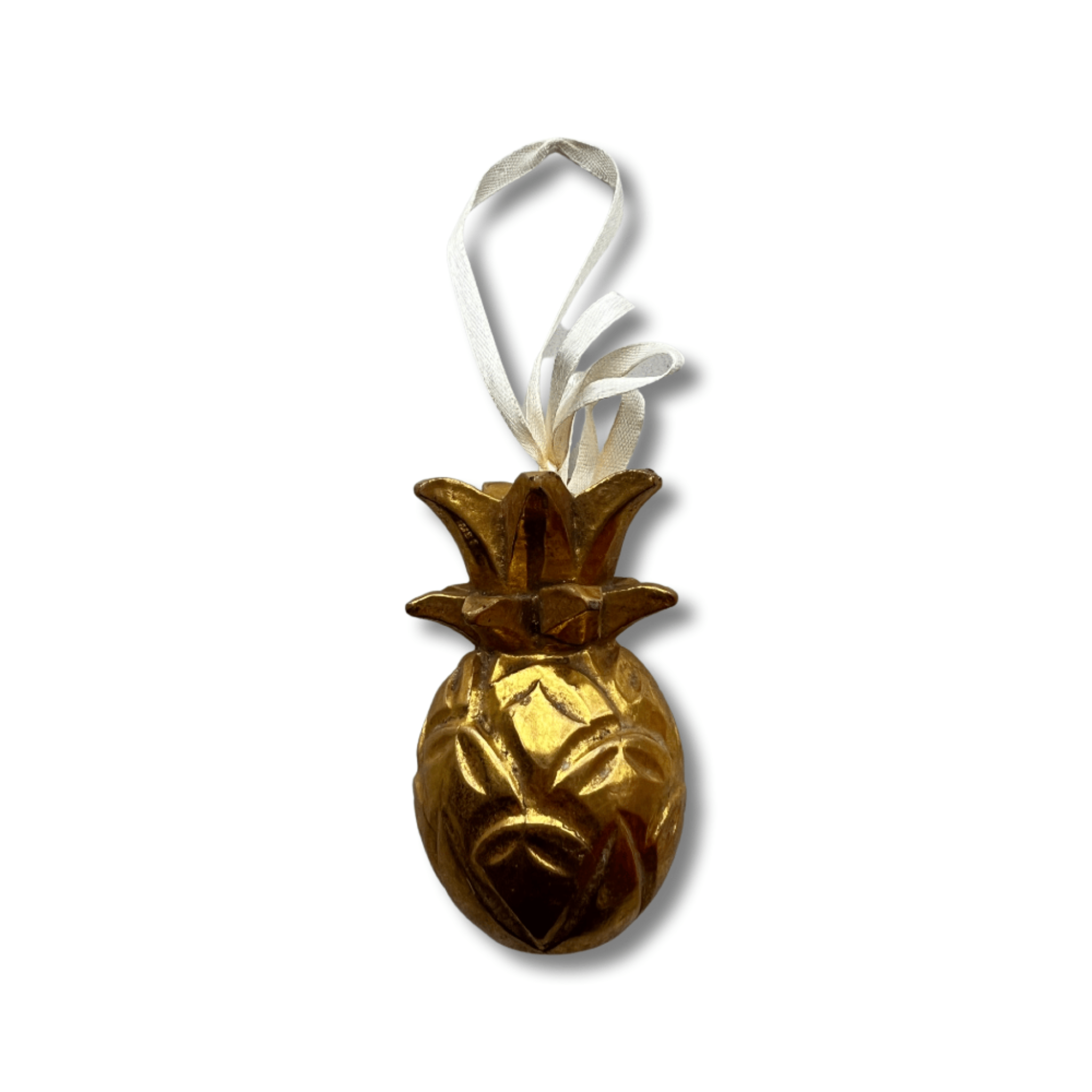 The pineapple has welcomed guests and symbolized hospitality for centuries—a tradition the Ananas Ornament brings to your holiday tree. Balinese artisans carve each pineapple from sustainably sourced wood, meticulously shaping the textured segments and crown of leaves that define this iconic fruit. Rich gold paint is applied in careful layers, creating a metallic shimmer that elevates the ornament from charming to elegant.