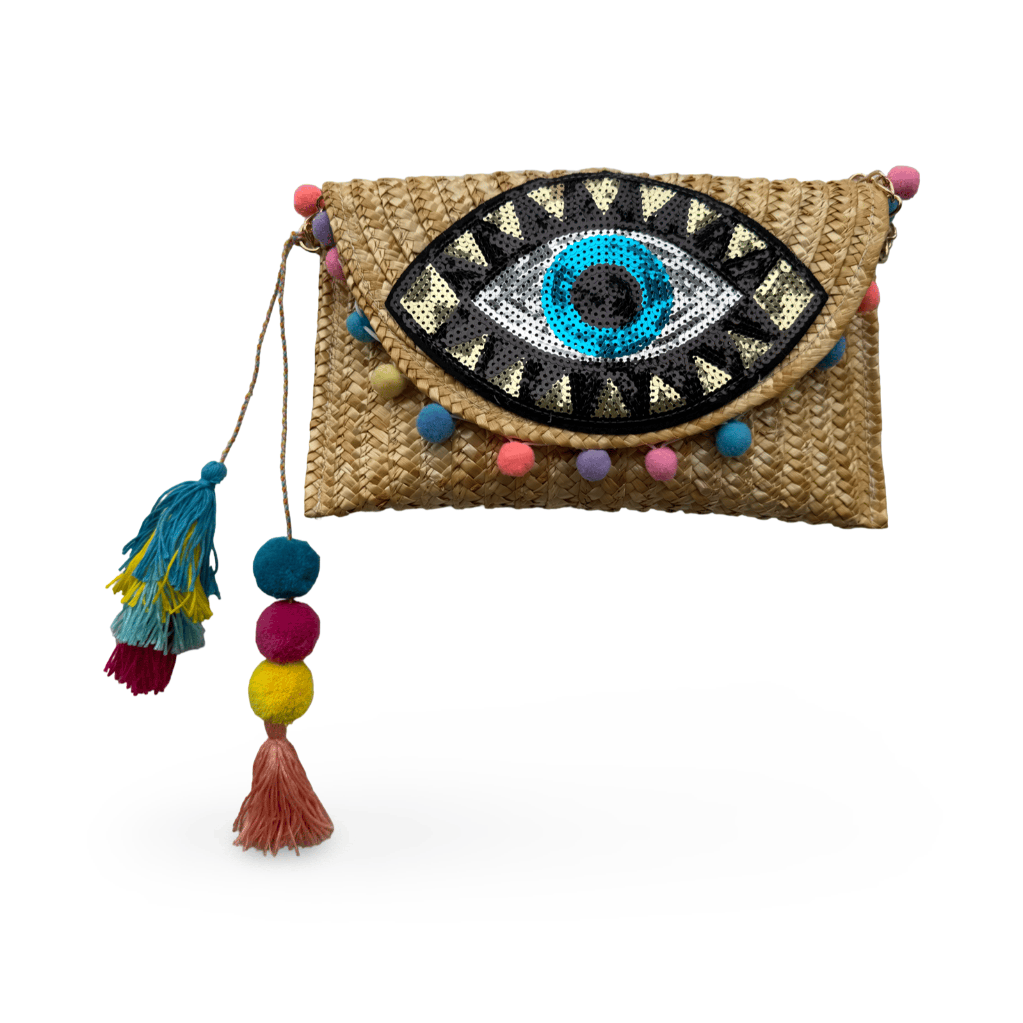 Embrace effortless elegance with the Aviva Clutch, where intricate sequin craftsmanship transforms natural straw into a sophisticated statement accessory. Skilled artisans meticulously apply shimmering sequins in a distinctive evil eye pattern—a timeless symbol of protection and good fortune that has adorned travelers and tastemakers across cultures for millennia. The beige straw base provides a refined neutral foundation that elevates any ensemble, while the sequin detailing catches and reflects light with subtle brilliance, adding just the right amount of sparkle without overwhelming your look.