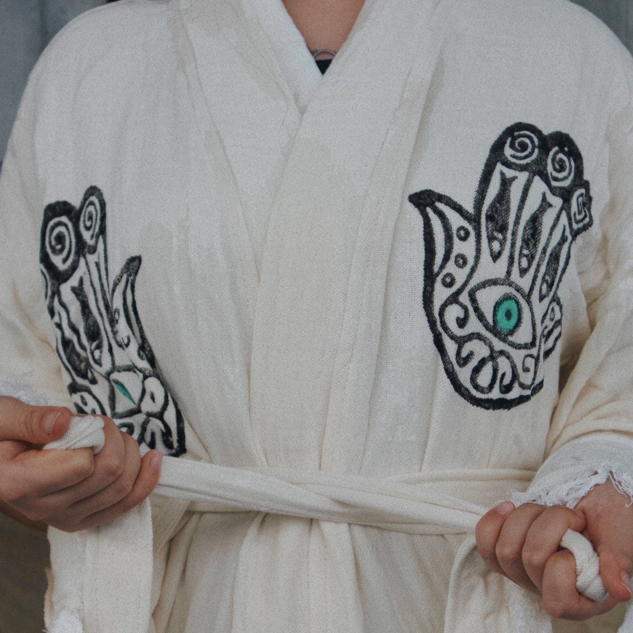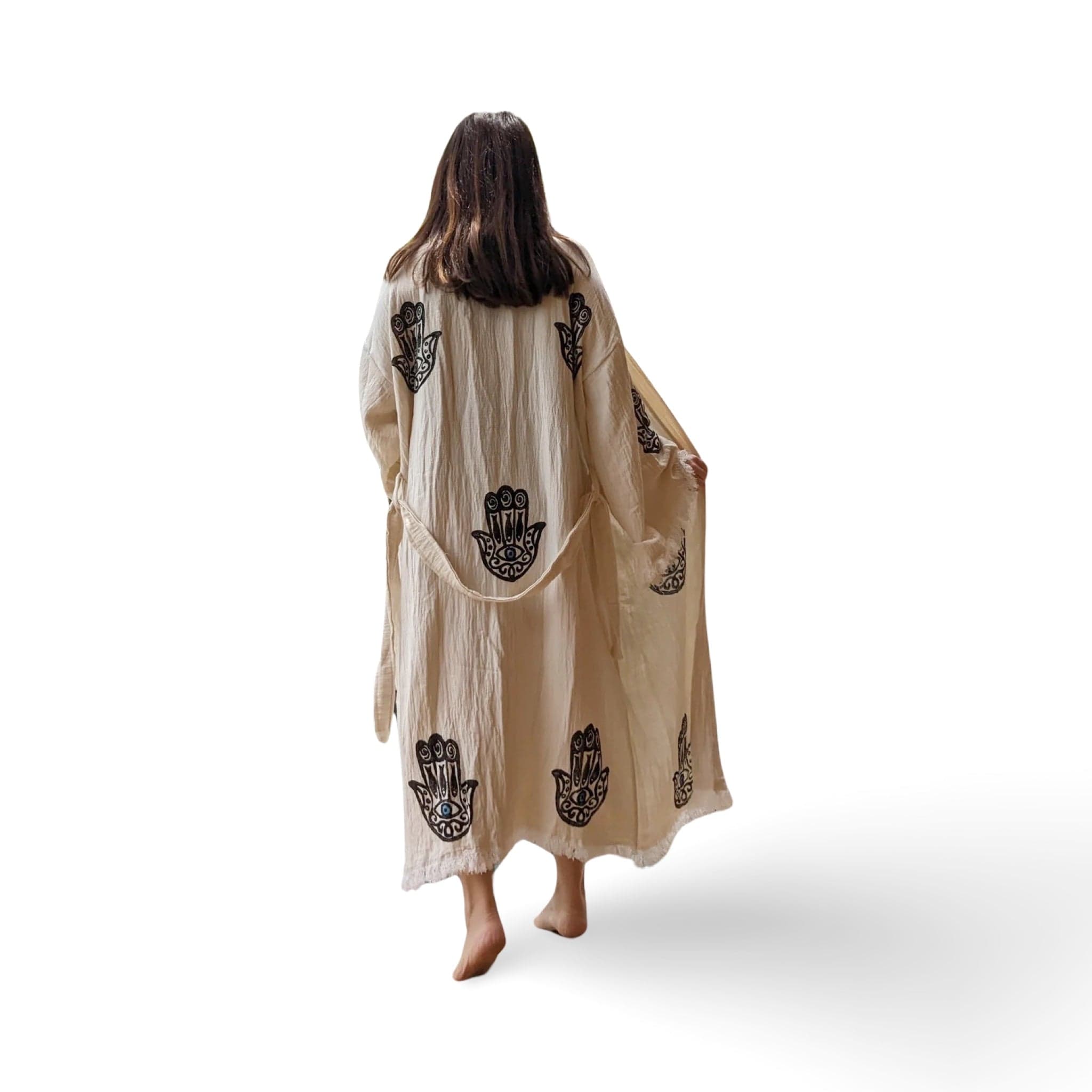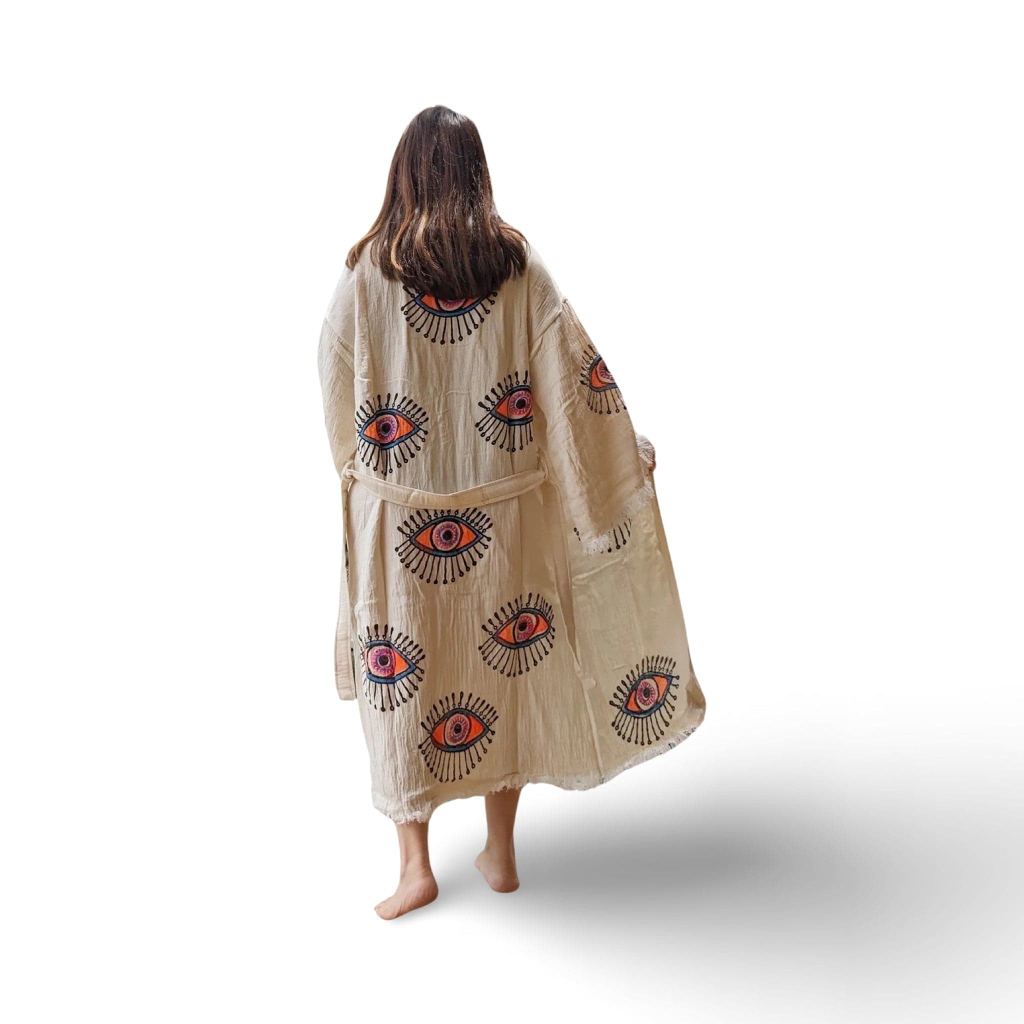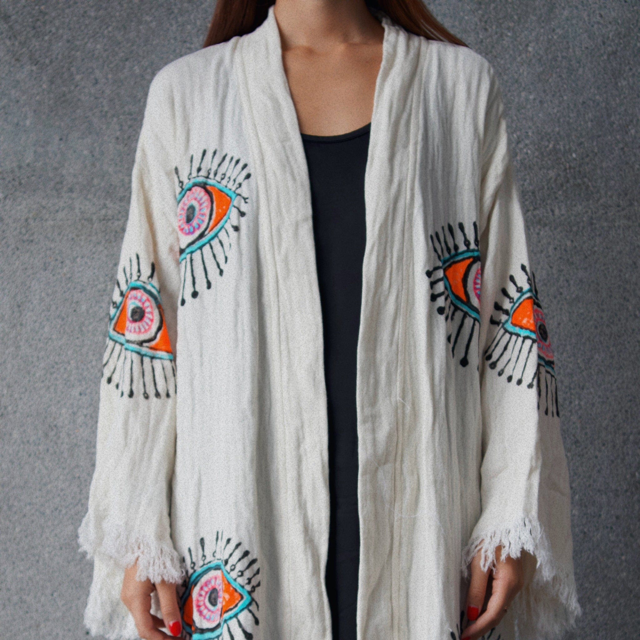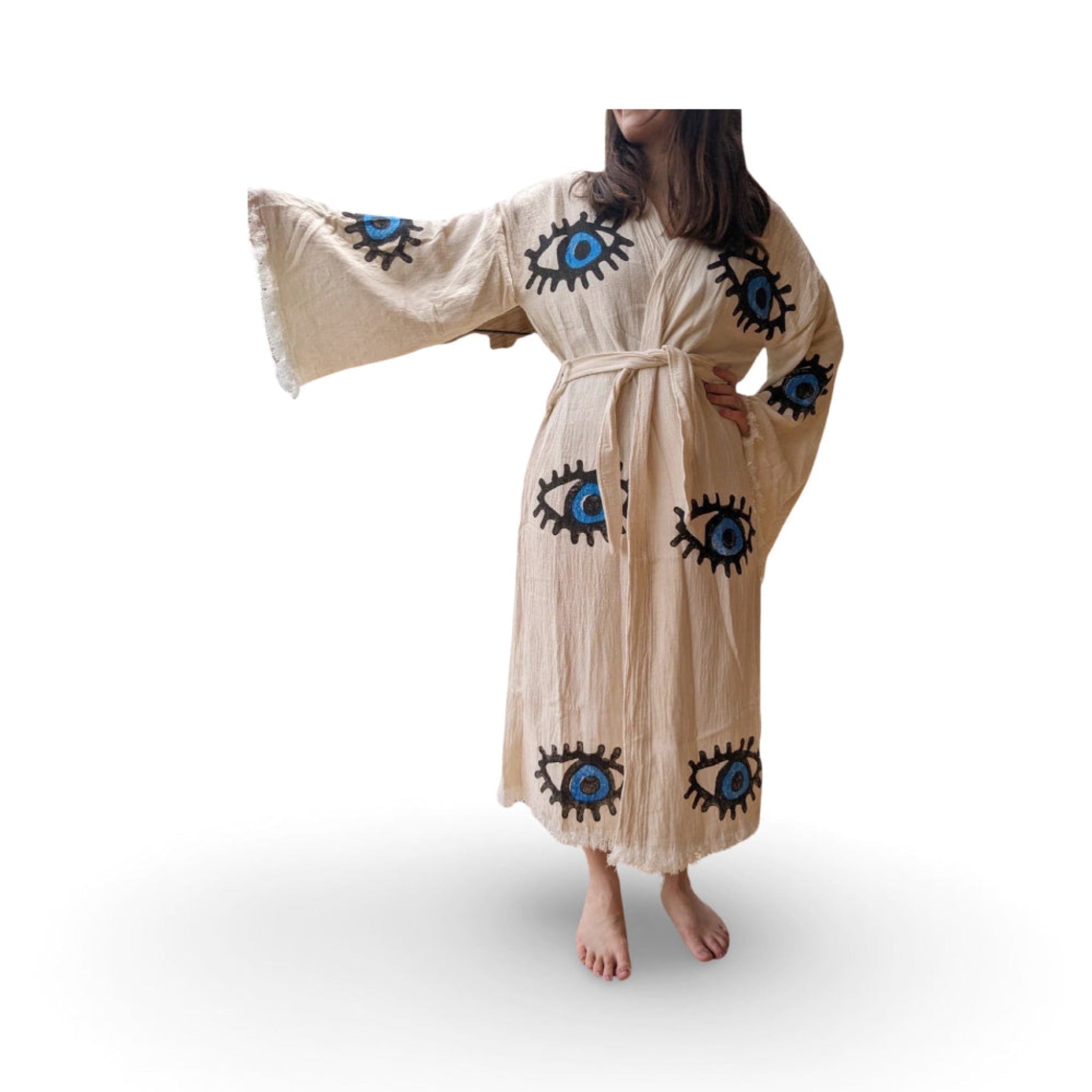 Crafted from lightweight, breathable cotton by skilled Lebanese textile artisans, this elegant piece features beautiful evil eye embroidery that adds both protective symbolism and bohemian sophistication to your resort wardrobe. Artisans carefully create each one with meticulous attention to detail, hand-embroidering the intricate evil eye motifs that have protected travelers and brought good fortune for centuries. The airy fabric drapes beautifully while allowing your skin to breathe, making it perfect for hot summer days, beach vacations, or poolside lounging. The roomy, relaxed fit makes it ideal for slipping on over swimsuits as a beach cover-up, wearing open as a spa robe, cinching at the waist as a stylish loungewear layer, or pairing with jeans for effortless resort chic. The versatile design transitions seamlessly from beach to brunch, pool to dinner, making it an essential piece for vacation packing. The vibrant embroidery adds Lebanese craftsmanship and cultural depth while the comfortable construction ensures all-day wearability. Available in multiple colors to suit your personal style and vacation aesthetic. Because each one is individually embroidered, slight variations in stitching make every piece uniquely yours. Perfect for beach vacations, resort getaways, spa weekends, or as a thoughtful gift for travelers, beach lovers, or anyone who appreciates versatile resort wear with artisan character. Pair with our Tyre Kaftans for more Lebanese resort styles.