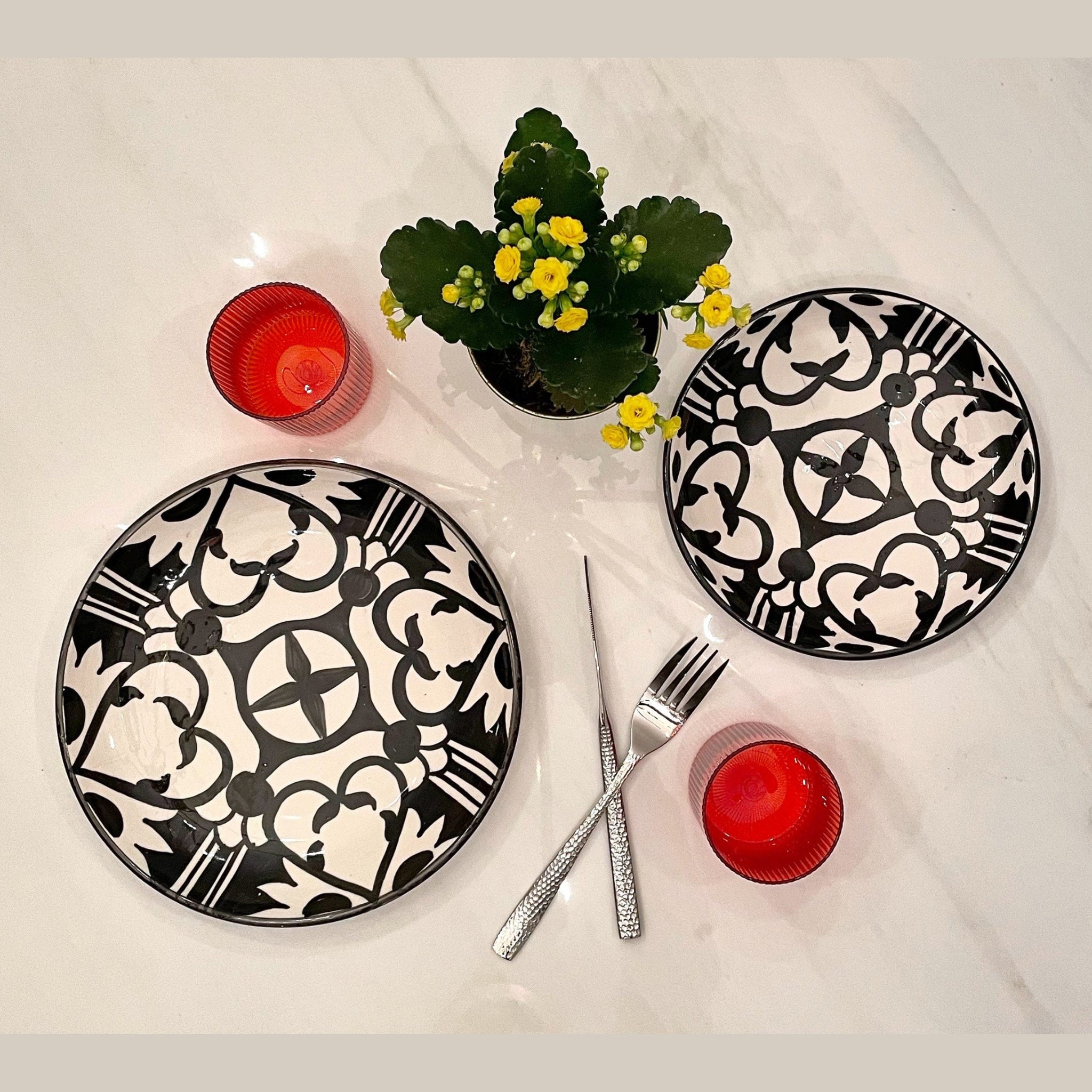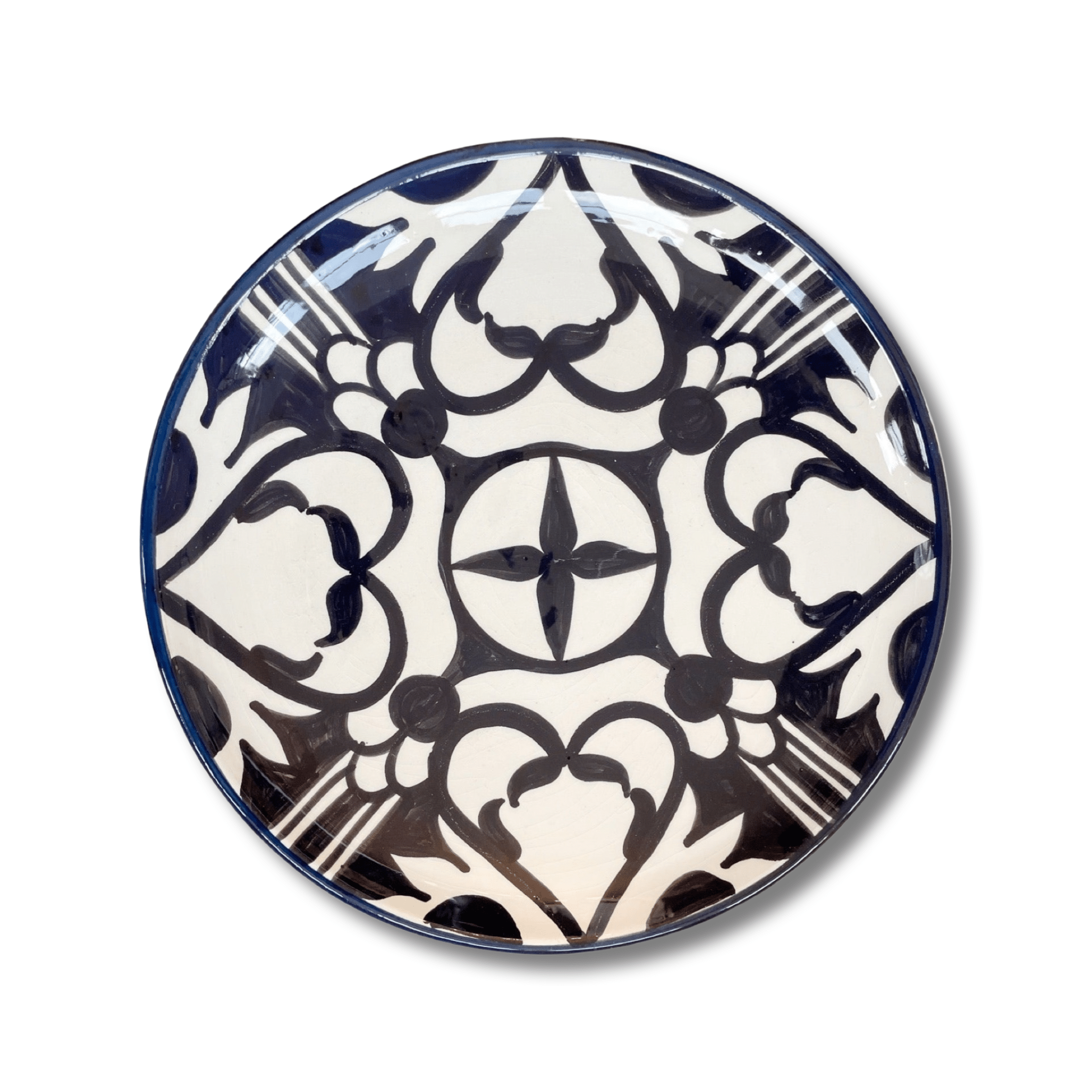 Set the stage for memorable meals with the Azala Dinner Plate, where Moroccan ceramic tradition meets everyday elegance in a piece designed to elevate every dining experience. Crafted in Morocco's historic pottery workshops, this 27cm dinner plate features bold black-and-white geometric patterns inspired by centuries-old Moroccan tilework found in riads and hammams. The striking graphic design transforms ordinary meals into special occasions, making weeknight dinners feel intentional and holiday gatherings unforgettable. This is the plate for the person who believes presentation matters, who serves Christmas dinner with pride, who hosts Thanksgiving with style, who creates beautiful everyday table settings, or who simply refuses to eat off boring white dishes. The generous 27cm size accommodates full dinner portions—protein, vegetables, and starches—with room for thoughtful plating that makes food look as good as it tastes. The durable ceramic construction withstands daily use while the high-contrast pattern hides minor stains and utensil marks better than solid colors. Because each plate is individually painted by Moroccan artisans, yours carries subtle variations in pattern and brushwork—small signatures of the craftsperson's hand that make it authentically unique.