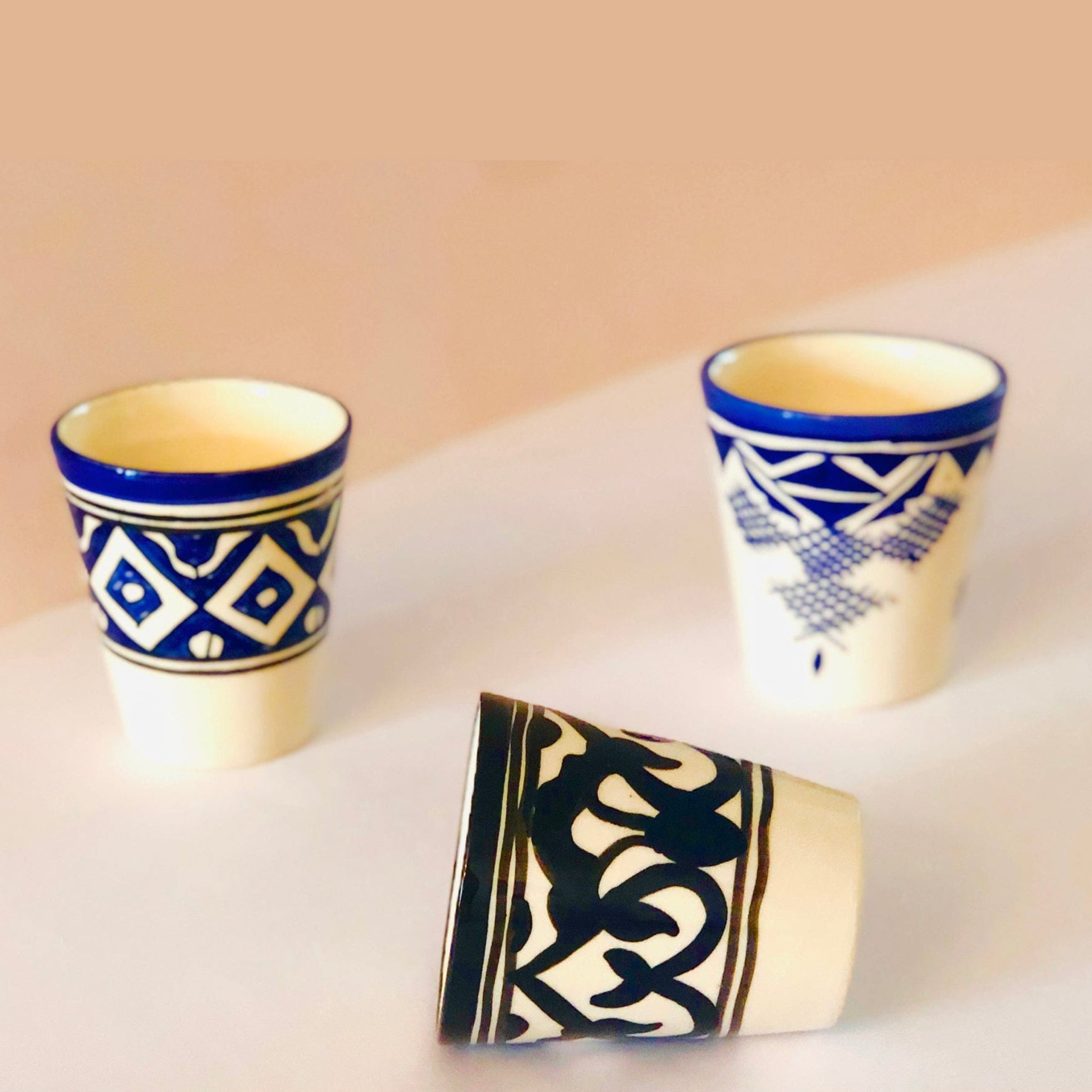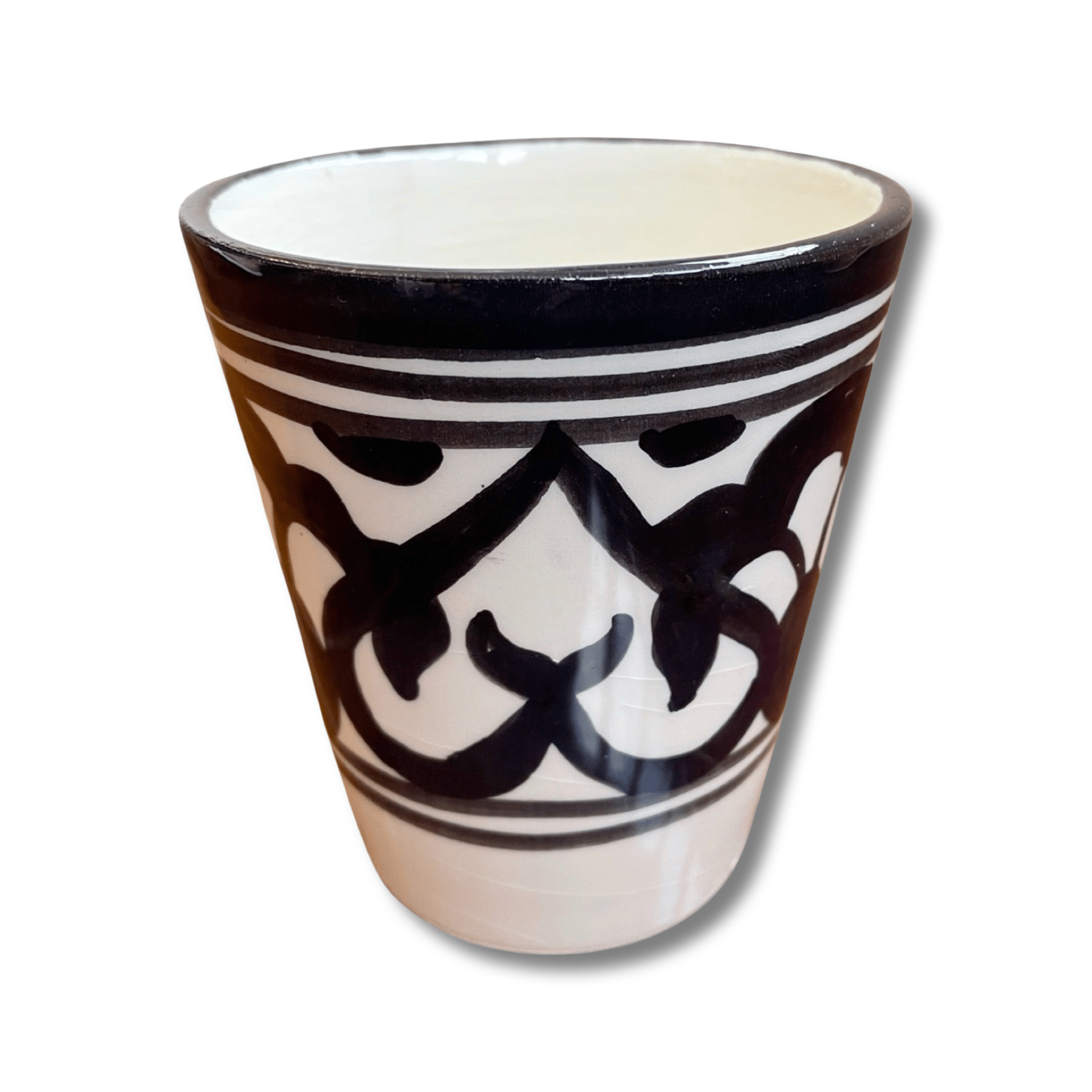Master ceramic artisans in Morocco create this striking Azala Water Glass, a beautiful celebration of North African artistry and cultural heritage. Skilled craftspeople carefully apply bold black and white geometric patterns by hand, drawing from traditional Moroccan design motifs that have adorned homes, palaces, and riads across North Africa for centuries. These intricate patterns blend traditional Moroccan artistic heritage with contemporary style, creating pieces that honor the past while fitting seamlessly into modern homes. The striking contrast of black against white creates captivating visual drama that makes every sip a visual delight. Each delicate brushstroke is applied by hand, requiring exceptional skill, steady hands, and artistic vision to create the precise geometric patterns that make this glass so distinctive. Because each glass is individually hand-painted, slight variations in the patterns, brushwork, and overall design make every piece uniquely yours—no two glasses are exactly alike. These variations are hallmarks of authentic artisan work, ensuring your glass is truly one-of-a-kind. Perfect for everyday dining or special occasions, this elegant glass brings authentic North African artistry to your table. Whether you're serving water, juice, iced tea, or cocktails at casual family dinners, elegant dinner parties, or Christmas celebrations, this beautiful glass adds cultural sophistication and timeless style to every occasion. The generous size provides ample capacity while the durable ceramic construction withstands daily use.