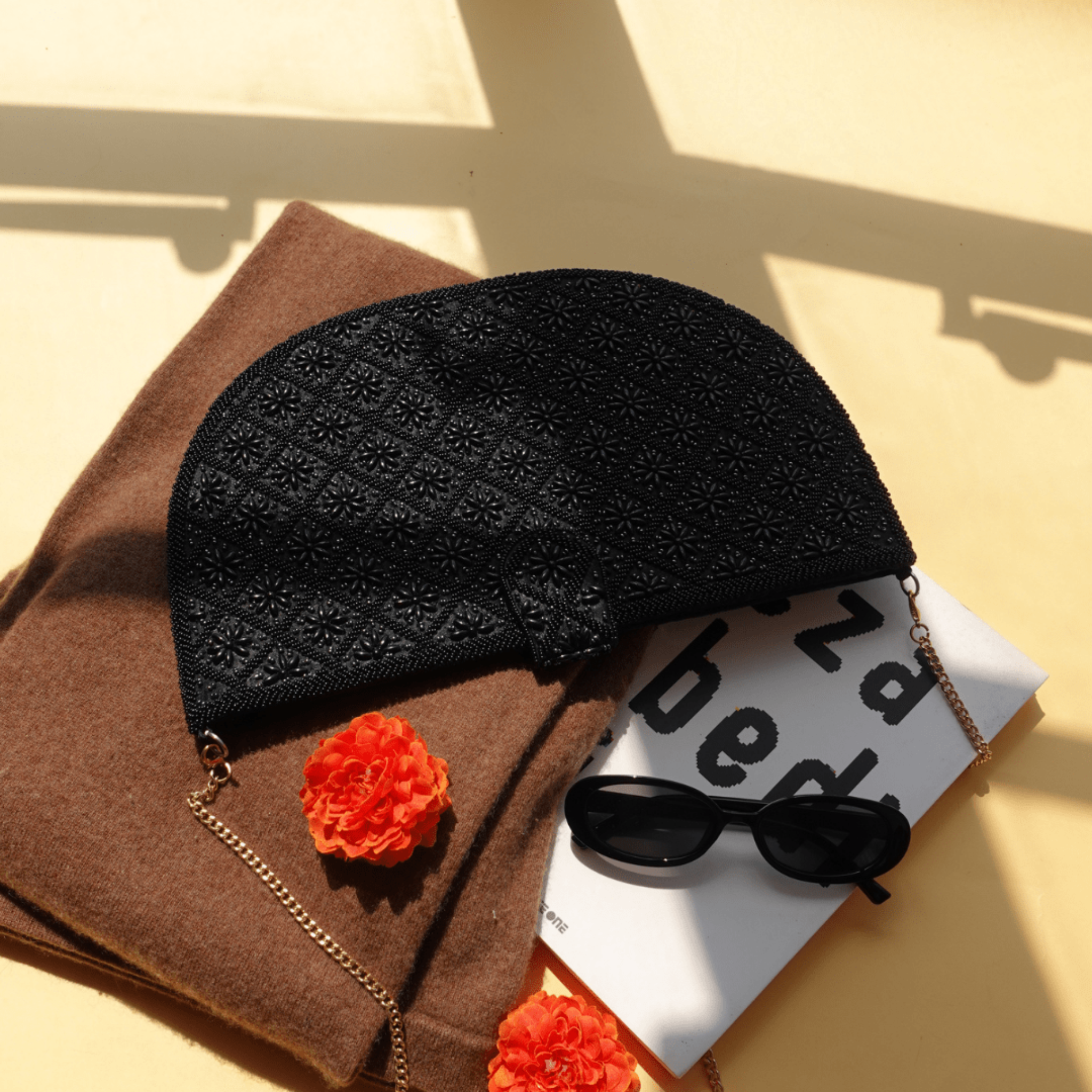 The elegant crescent silhouette of this Black Beaded Semi-Lune Clutch offers something rectangular clutches simply cannot—graceful curves that complement the female form while providing significantly more interior space. At 32 cm x 20 cm, this generously sized bag holds far more than typical evening clutches, accommodating your phone, wallet, makeup essentials, and even a small water bottle for long events where you need to stay hydrated and prepared. Indian beadwork specialists cover every inch of the curved surface with shimmering black beads, creating a sophisticated texture that catches light from every angle as you move. The semi-lune shape—named for its half-moon curve—has been favored by European aristocracy for centuries because it sits naturally against the body whether carried as a clutch or worn crossbody. Speaking of versatility, the detachable chain strap transforms this piece from formal clutch to casual-chic crossbody in seconds, making it appropriate for everything from black-tie galas to upscale brunches. Wear it tucked under your arm for maximum elegance at weddings and award ceremonies, or attach the strap for hands-free convenience at cocktail parties and networking events where you need to shake hands and hold drinks. The lightweight 282g construction means you can wear it crossbody all evening without shoulder fatigue. The all-black beading provides timeless sophistication that never goes out of style, coordinating effortlessly with any color palette in your wardrobe. This is the investment piece that works harder than any other bag in your collection, transitioning seamlessly from day to night, casual to formal, season to season.