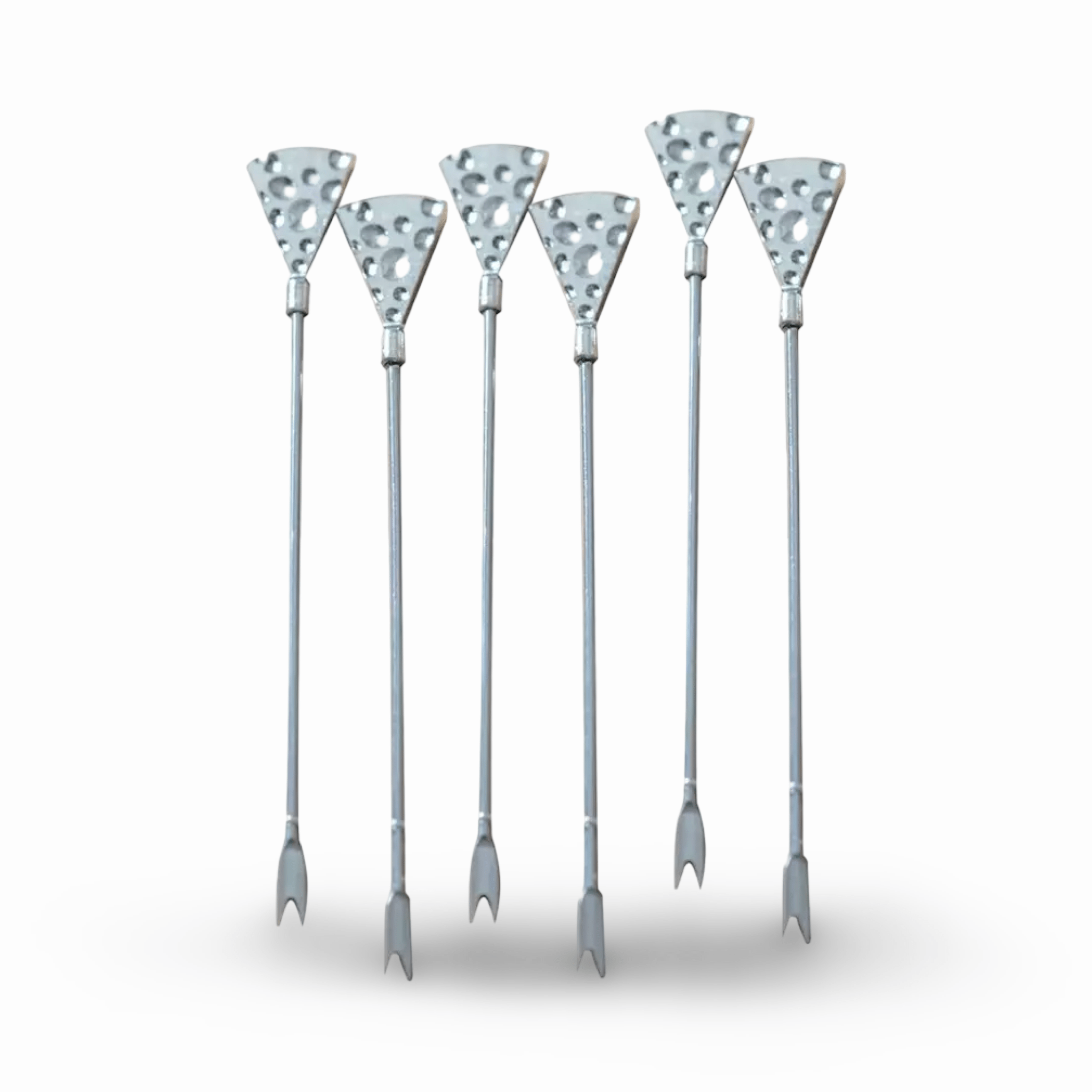 Transform your cocktail hour into an unforgettable experience with this premium set of 6 Chameli Appetizer Picks, where artisan metalwork meets modern entertaining. Crafted from high-grade stainless steel, each pick features a meticulously textured stem that creates captivating light reflections across your bar cart or cocktail table. The substantial 12cm length provides perfect control for spearing olives, pickled onions, cheese cubes, or gourmet garnishes, while the balanced weight ensures stability when resting on glassware rims.