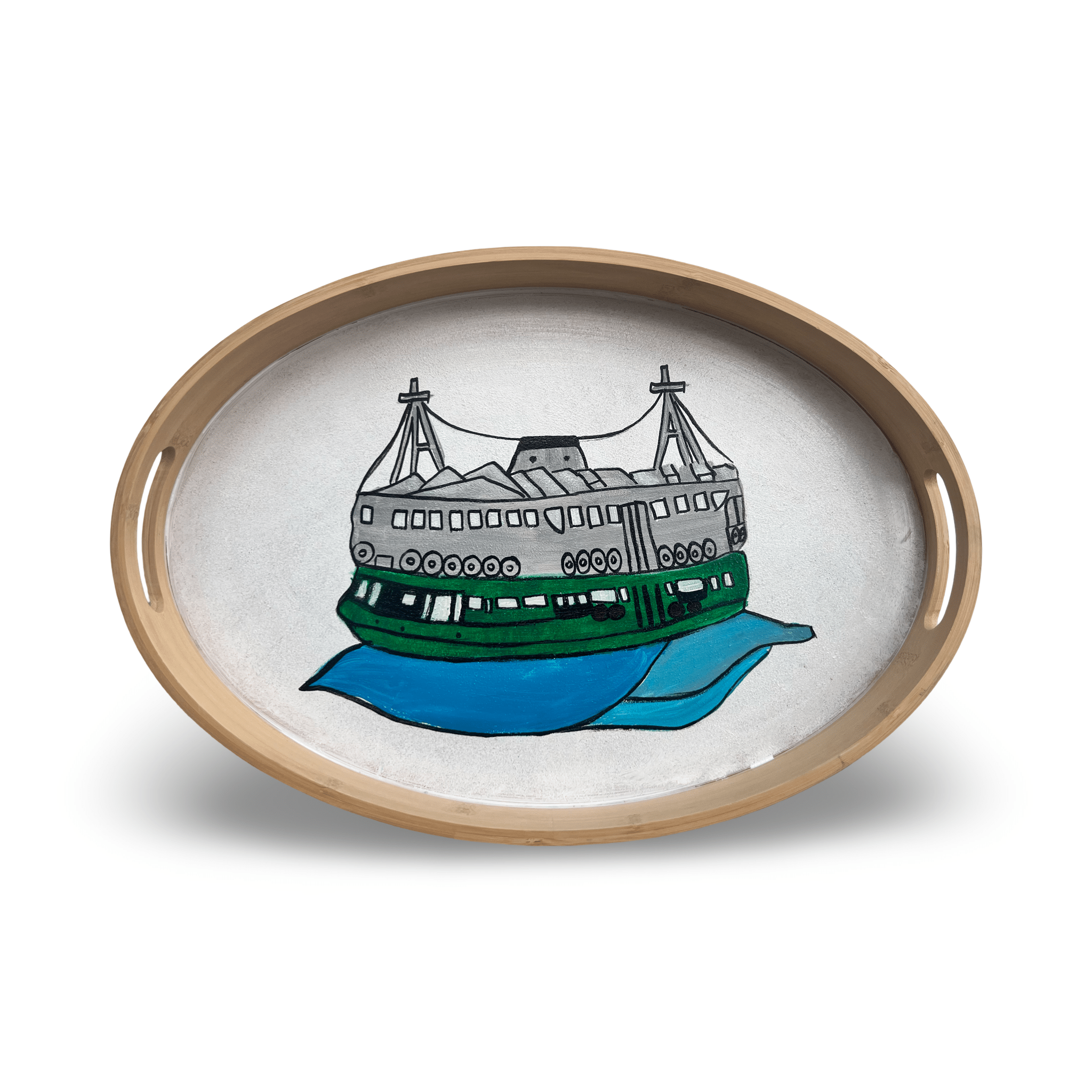 Hand-painted by skilled artisans in Jordan, each Hong Kong Star Ferry Tray brings the vibrant energy of Hong Kong's iconic green-and-white ferries to your home. Artisans meticulously hand-paint the beloved Star Ferry design onto this beautiful Hong Kong serving tray, capturing the bold colors and cultural charm of the legendary ferries that have crossed Victoria Harbour since 1888. This stunning piece of HK home decor makes every gathering pop with Hong Kong spirit. Because each tray is individually hand-painted, slight variations in the artwork make every piece uniquely yours—no two trays are exactly alike. Perfect for serving snacks and drinks or displaying as a statement piece, this Hong Kong souvenir is ideal as a Victoria Harbour gift or Hong Kong collectible. Whether you're looking for authentic Hong Kong memorabilia or a unique Hong Kong gift for ferry enthusiasts, this tray brings the city's maritime heritage to life. Handwash gently to keep the artwork cruising in style! For an alternative style, check out our Hong Kong Taxi Tray.