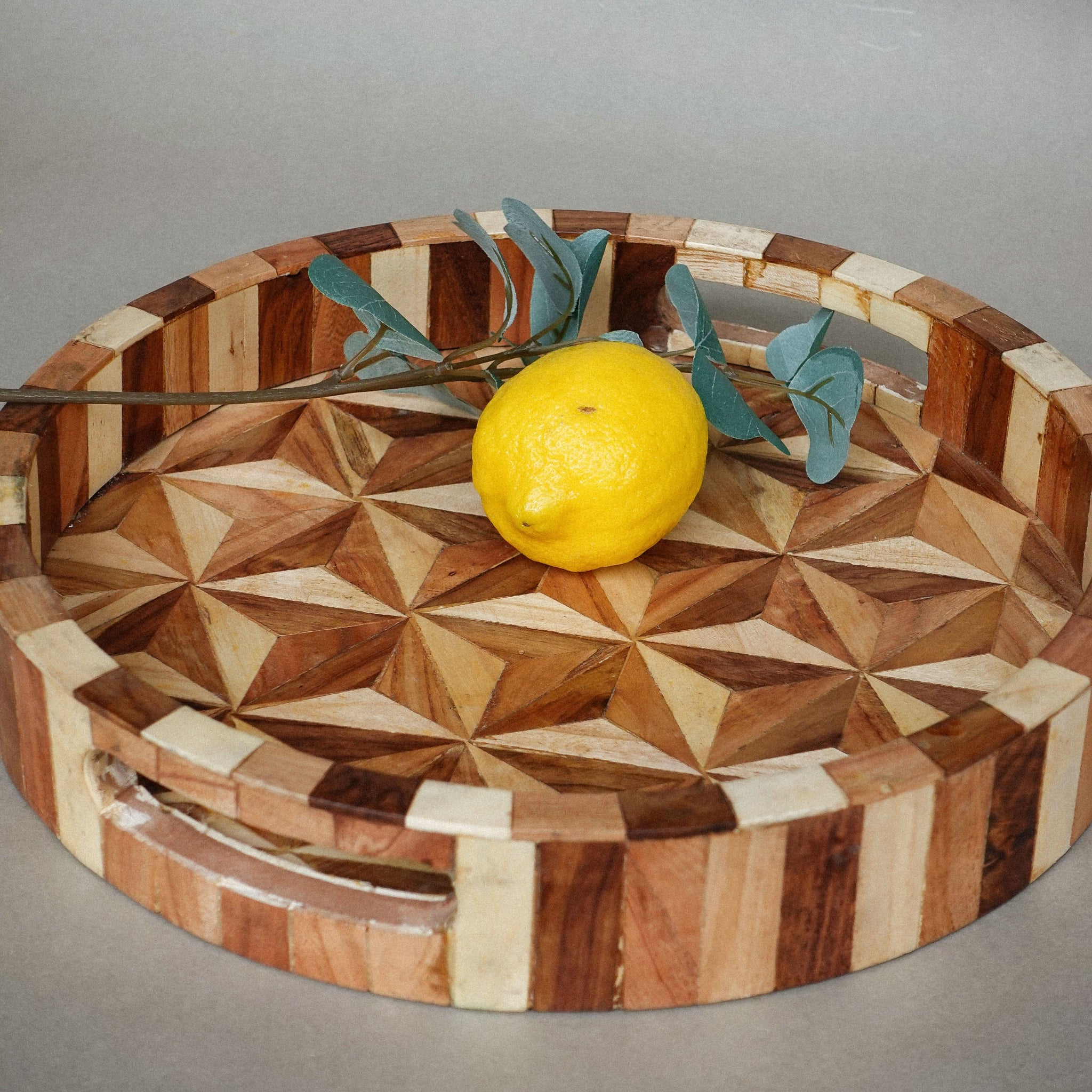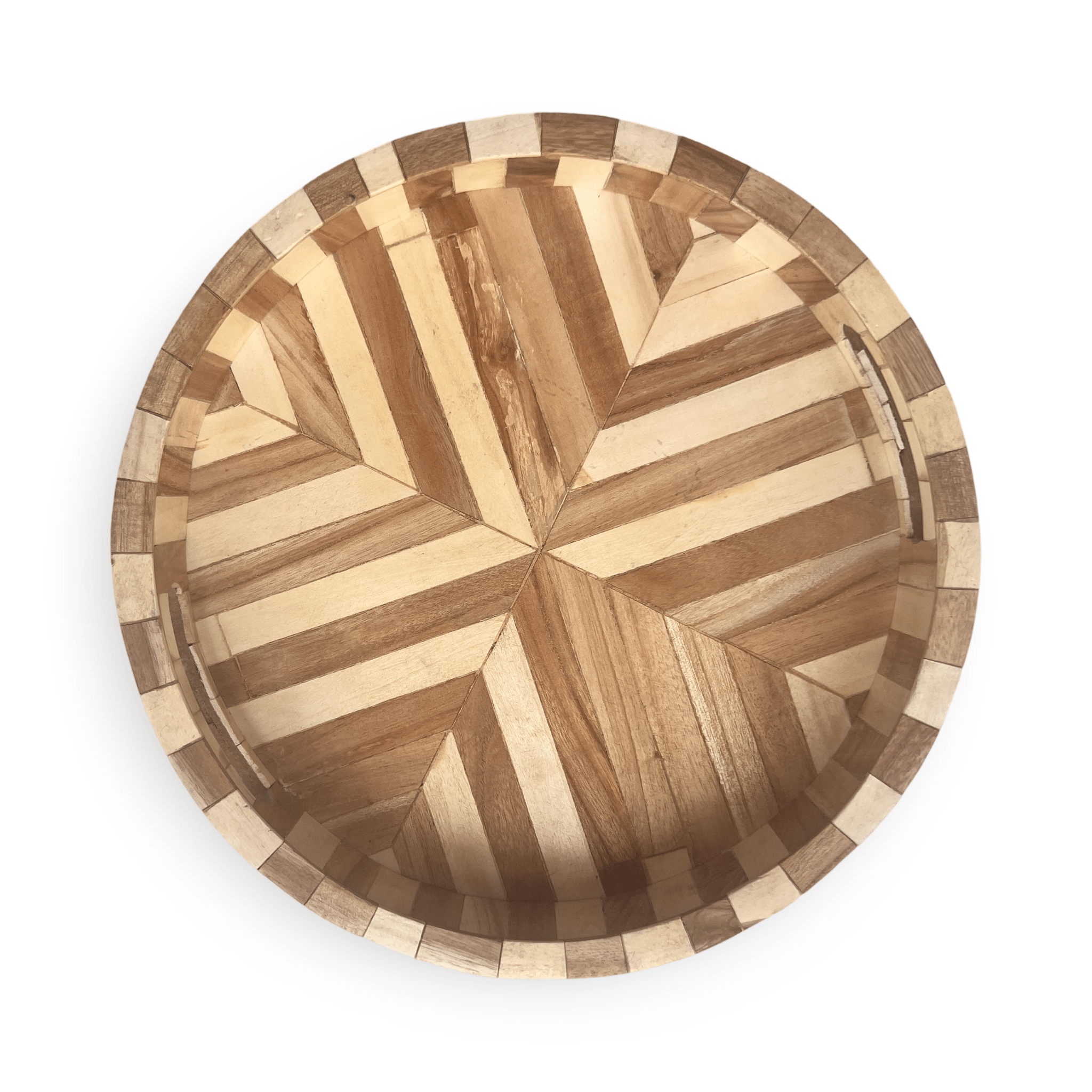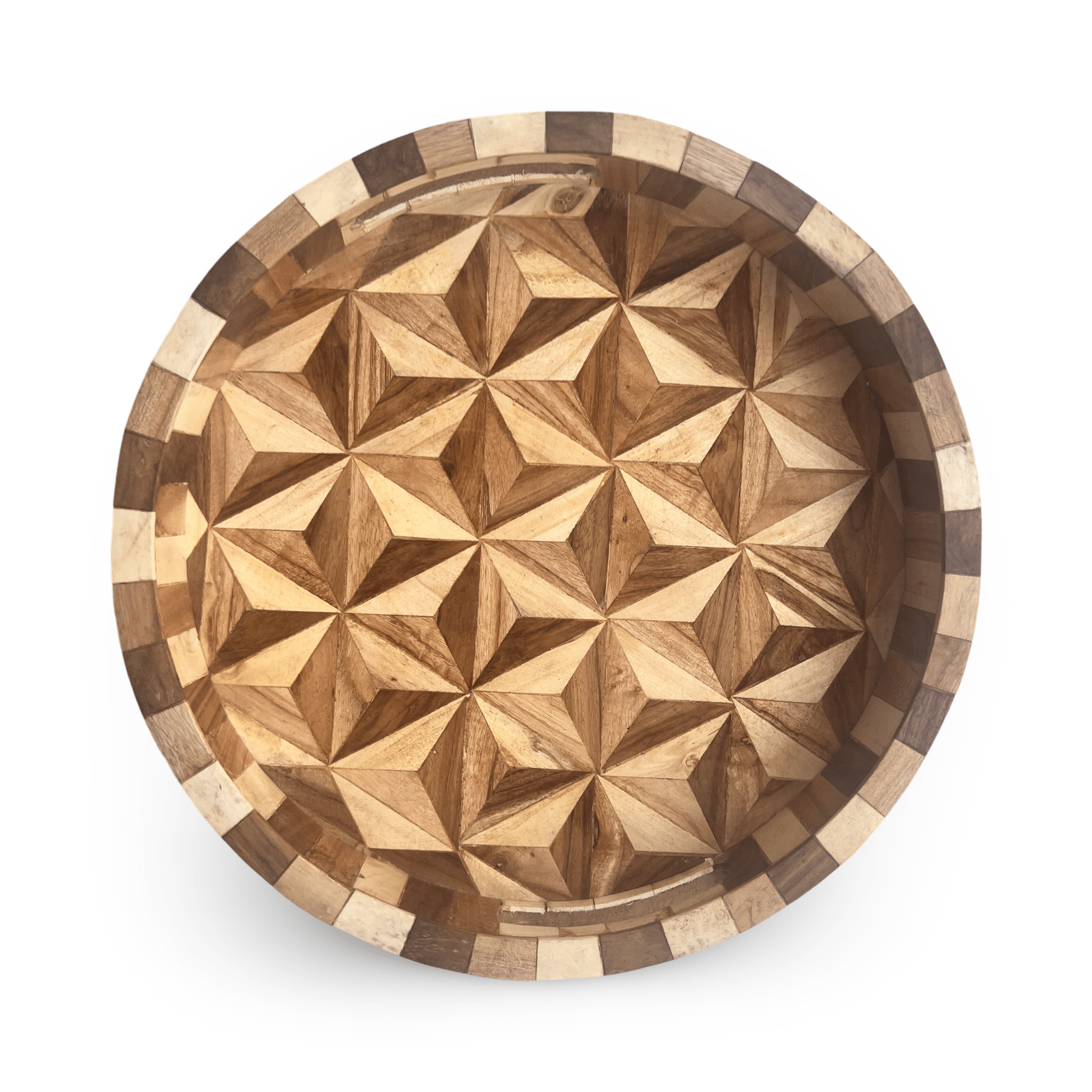 Hand-carved by skilled woodworkers in India, the Kalpana Round Tray showcases the artistry of traditional Indian woodcraft. Each tray is individually shaped from sustainably sourced materials using time-honored carving techniques passed down through generations. The intricate geometric patterns are meticulously carved by hand, while the smooth, polished surface highlights the natural grain and beauty. Because each tray is hand-carved from natural materials, every piece is unique with variations in grain, color tone, and carving details—signatures of authentic artisan work. Perfect as a stunning centerpiece, serving tray, or decorative accent that brings rustic charm and sustainable elegance to any space.