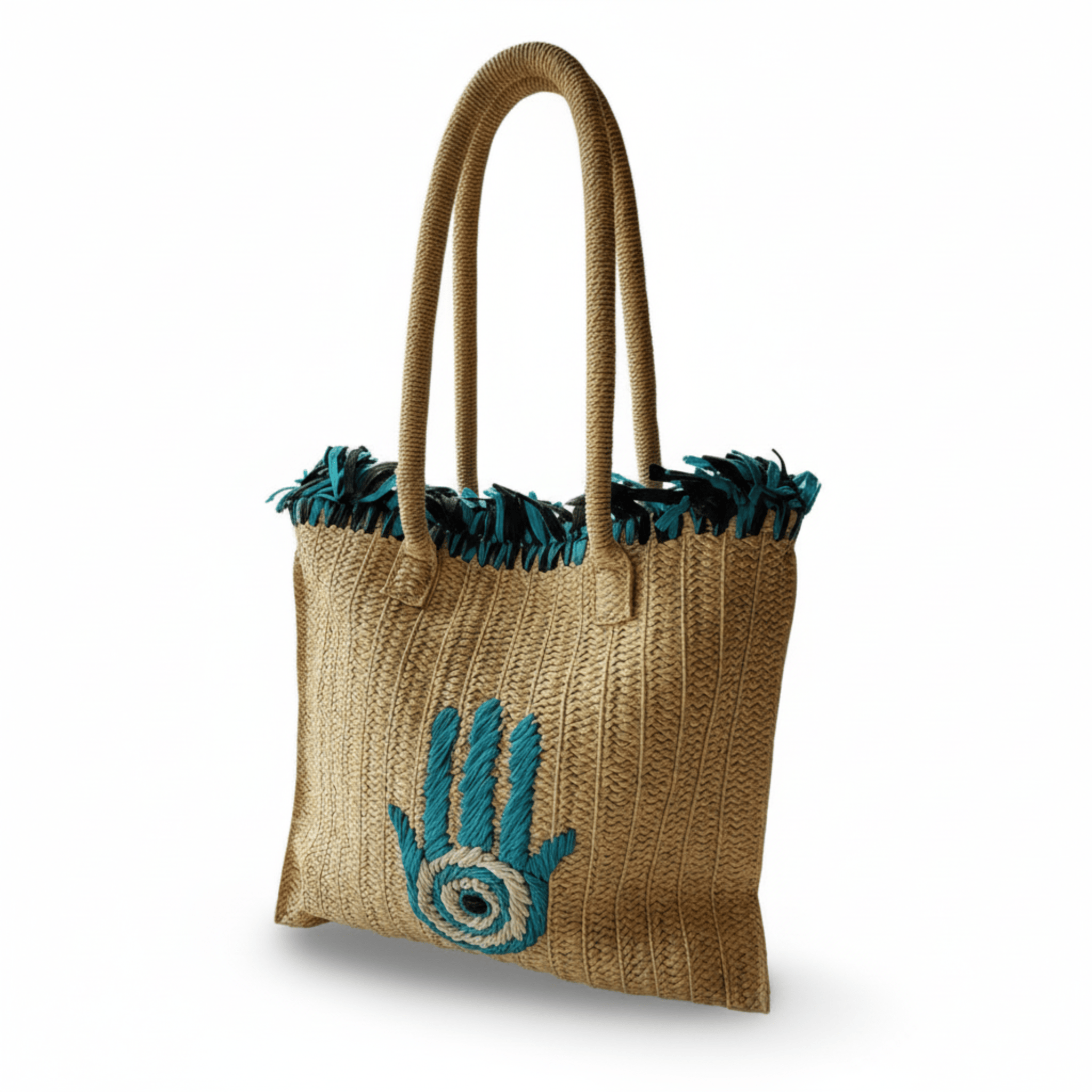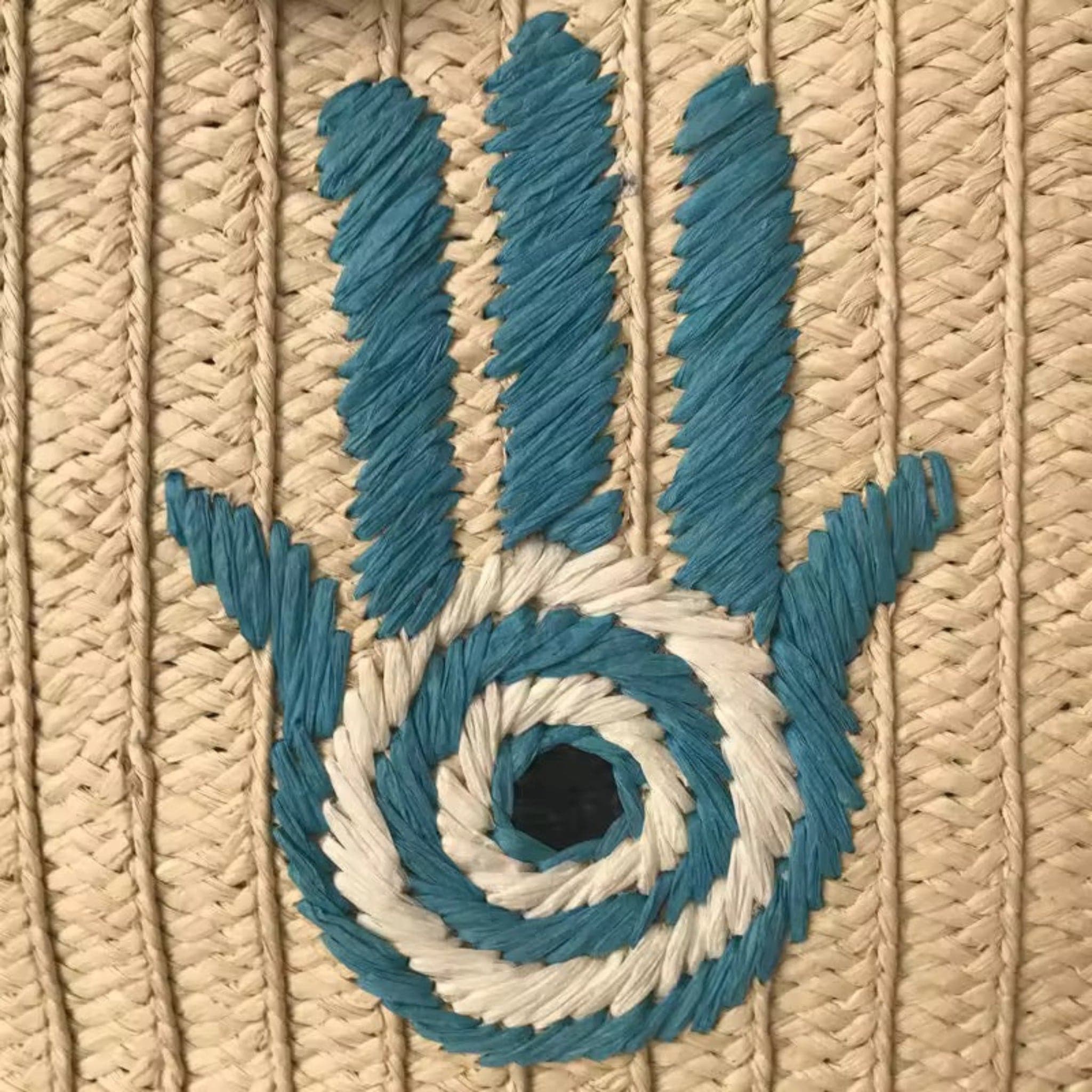 Embrace ancient protection and artisan beauty with the Marwa Hamsa Beach Bag, where intricate embroidery brings the sacred Hand of Fatima to life on natural beige straw. This isn't just a beach bag—it's a wearable talisman that carries thousands of years of Middle Eastern and Mediterranean tradition. Skilled artisans spend hours hand-embroidering each hamsa motif with vibrant threads, creating a textured, dimensional design that celebrates the craftsmanship of traditional needlework. The hamsa symbol, revered across cultures as a powerful emblem of protection, blessings, and good fortune, makes Marwa both spiritually meaningful and visually captivating.