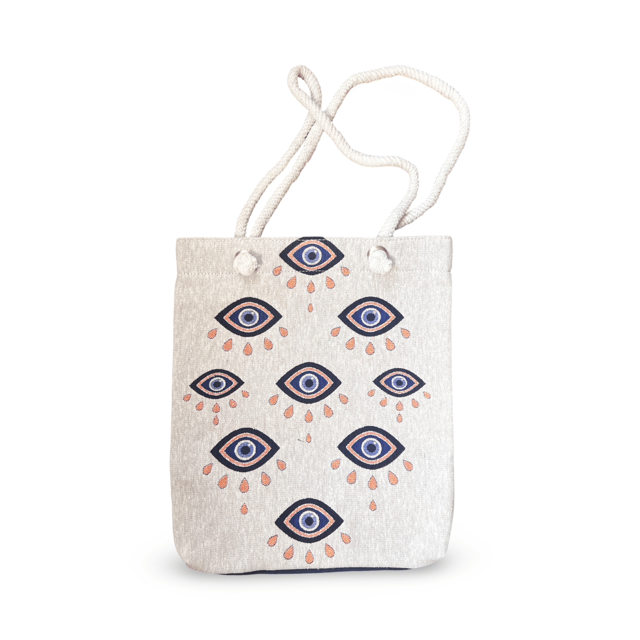 The striking evil eye embroidery evokes the intricate tilework found in Moroccan riads and hammams, where protective symbols have adorned doorways and courtyards for centuries. Sturdy canvas construction (38 x 43 cm) handles the demands of travel adventures—from navigating winding medina streets piled with market finds to carrying beach essentials along coastal promenades. The spacious interior holds travel journals, vintage treasures discovered in antique stalls, fresh produce from farmers markets, and daily necessities.