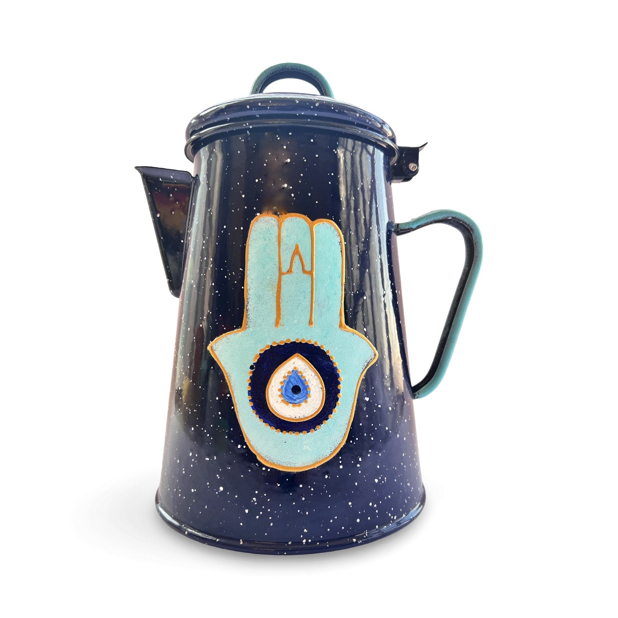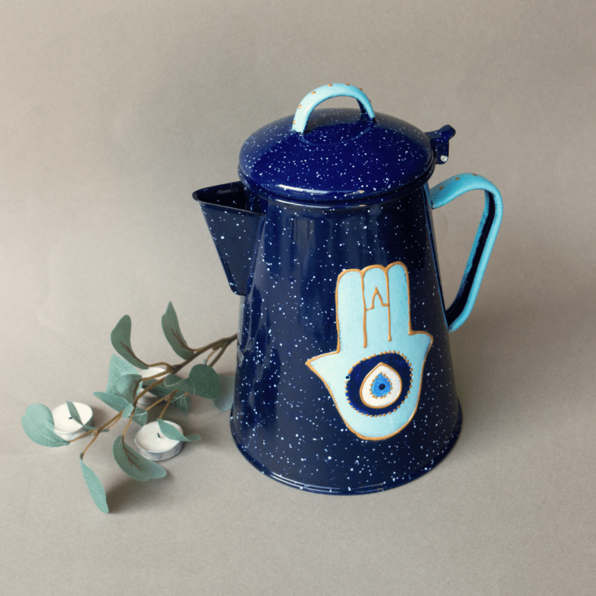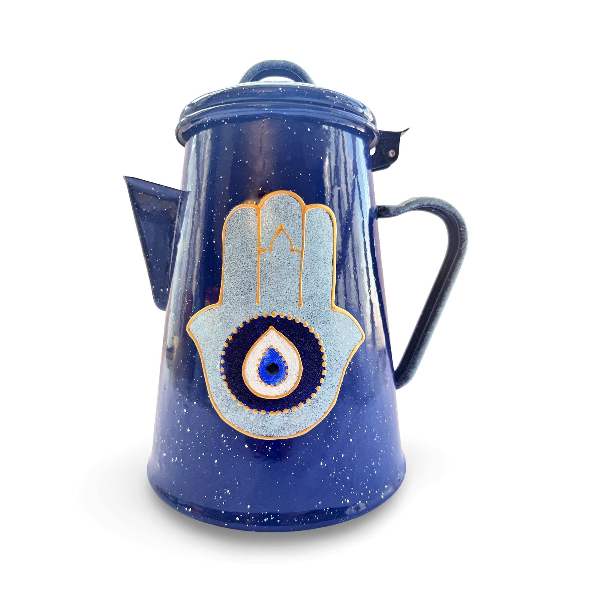 Hand-painted by skilled Jordanian artisans, each Metal Fatima Teapot celebrates the protective power of the Hamsa symbol with contemporary style. Artisans meticulously hand-paint the sacred Hamsa (Hand of Fatima) motif onto this elegant tea kettle, creating pieces that carry centuries of protective wisdom and cultural significance. The beautiful blue finish and intricate Hamsa design add both elegance and meaning to your tea rituals. This versatile tea server features generous capacity perfect for entertaining guests, while the comfortable handle ensures easy pouring. Because each beverage pot is individually hand-painted, slight variations in the patterns ensure no two pieces are exactly alike—making yours truly one-of-a-kind. These hand-painted metal teapots resonate with style and tradition, bringing the warmth of Middle Eastern hospitality to every pour. Perfect as a meaningful gift or to add cultural charm to your home. Pair with our Hamsa Teacups for a coordinated tea service.