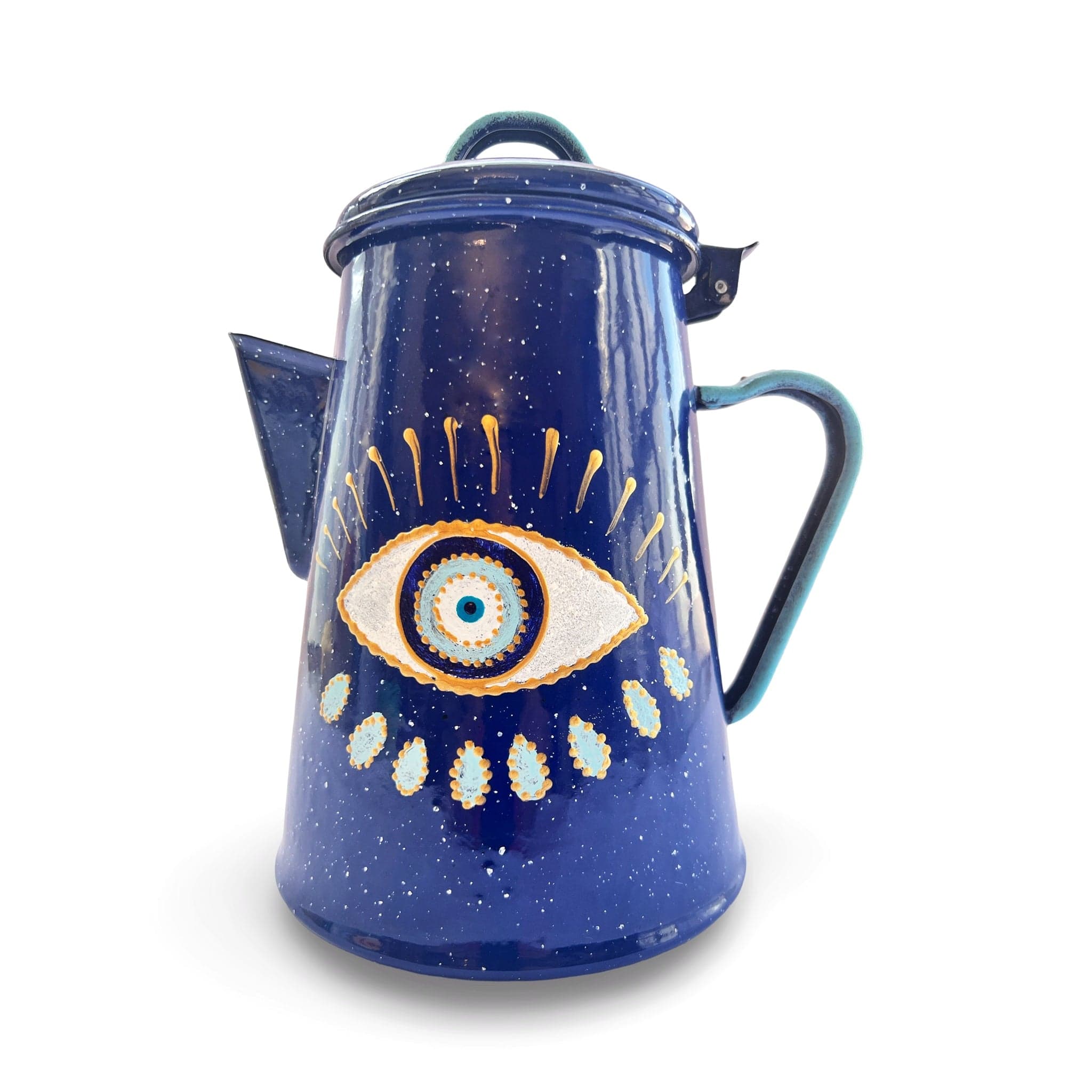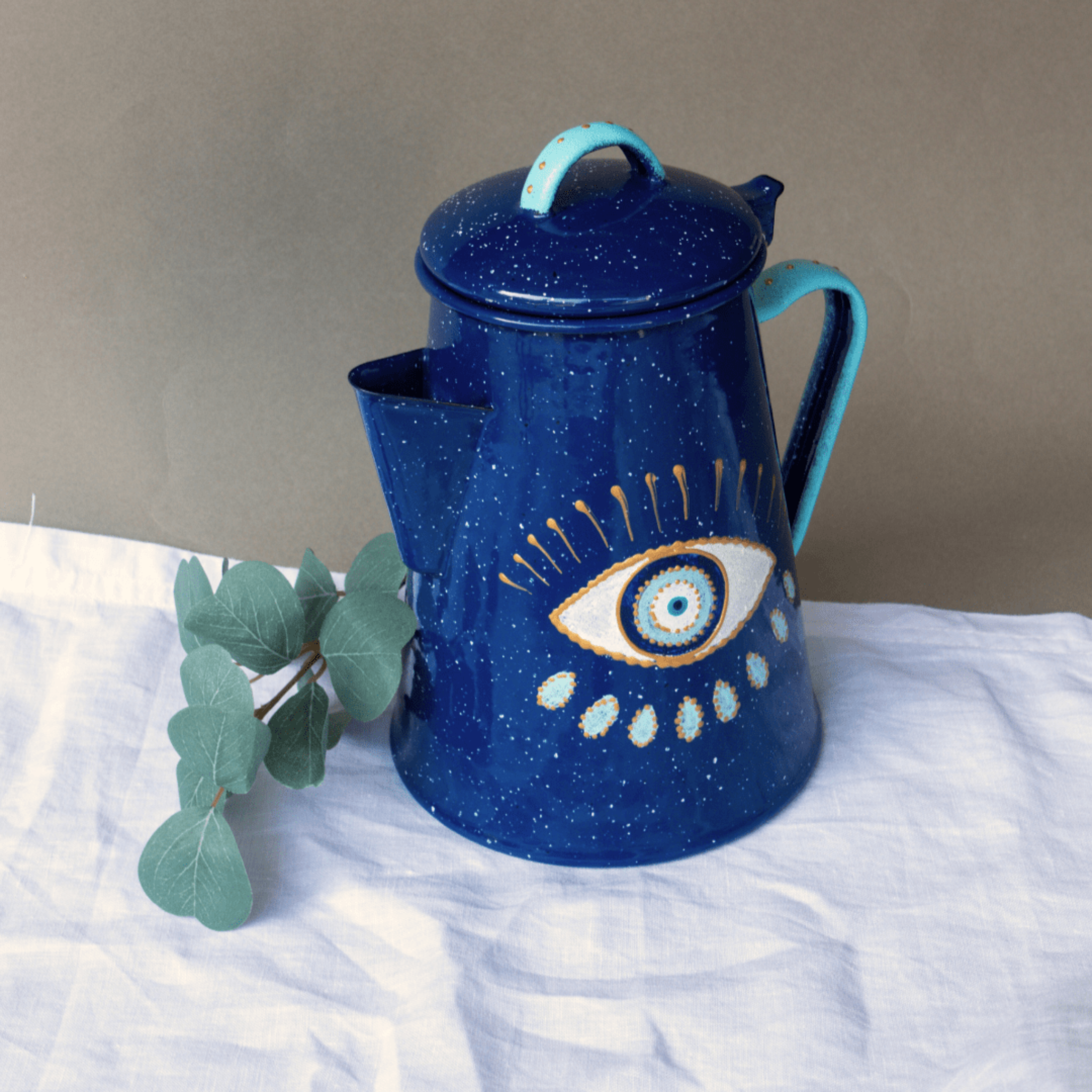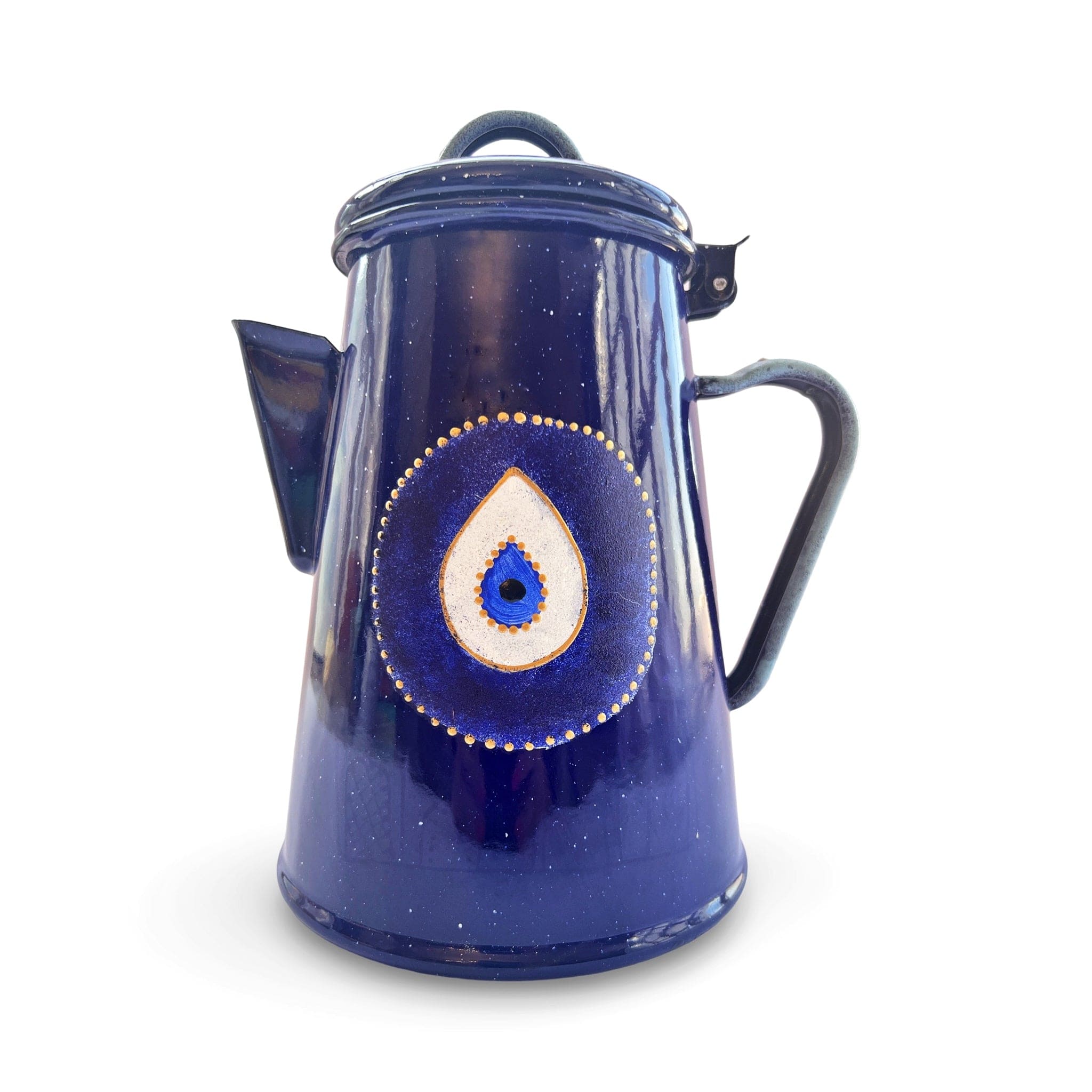Skilled Jordanian artisans create each Metal Nazar Teapot as a stunning celebration of Middle Eastern craftsmanship and cultural heritage. Artisans meticulously paint the iconic evil eye motif onto this elegant tea kettle, creating pieces that carry the protective symbolism revered across Mediterranean and Middle Eastern cultures for thousands of years. The beautiful blue finish and intricate evil eye design add both elegance and meaning to your tea rituals. This versatile tea server features generous capacity perfect for entertaining guests, while the comfortable handle ensures easy pouring. Because each beverage pot is individually painted, slight variations in the patterns ensure no two pieces are exactly alike—making yours truly one-of-a-kind. These metal teapots bring style and tradition to every pour, transforming your tea service into a celebration of Jordanian artistry and hospitality. Perfect as a meaningful gift or to add cultural charm to your home. Essential tableware for Hong Kong homes seeking artisan teapots and premium tea service. For other design options, explore our Metal Fatima Teapots.