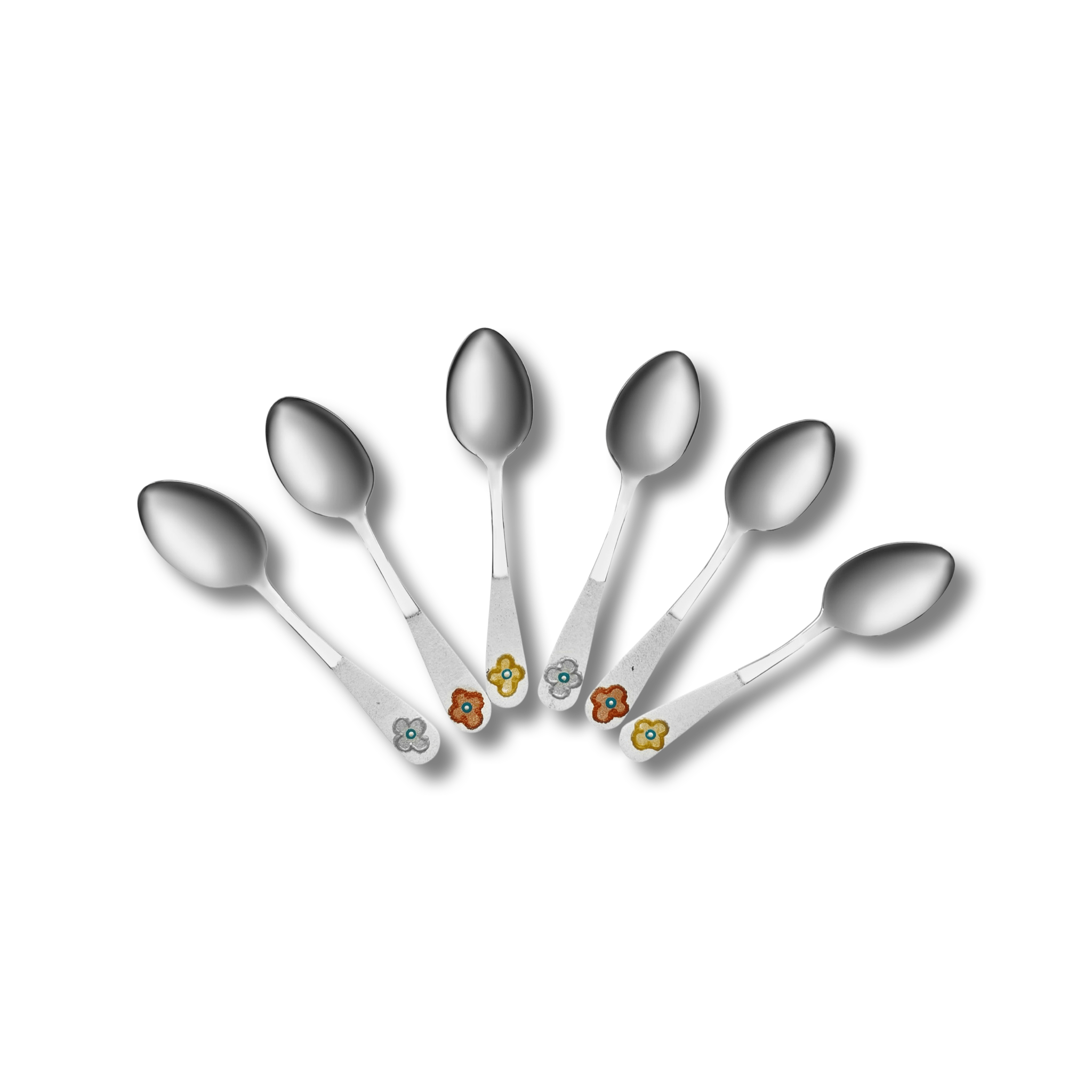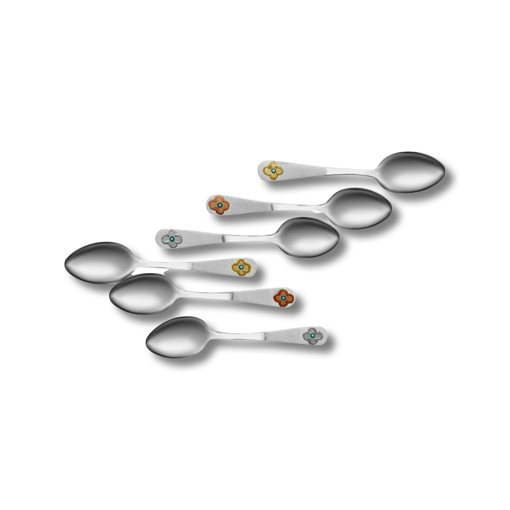 Skilled artisans in Jordan create each teaspoon in this set of 6, showcasing the delicate artistry of Middle Eastern metalwork and traditional decorative painting. Craftspeople carefully apply pretty metallic flower designs onto sturdy stainless steel, creating pieces that blend functionality with cultural charm and artistic beauty. Drawing from generations of Jordanian artistic tradition, artisans apply each delicate petal, leaf, and stem with exceptional precision and artistic vision to create the intricate floral patterns that make these spoons so special. The shimmering metallic finish catches light beautifully, adding elegance and visual interest to your table setting. Because each teaspoon is individually painted, slight variations in the floral patterns, brushwork, and metallic finish make every set uniquely yours—no two spoons are exactly alike. These natural variations are signatures of authentic craftsmanship, ensuring your set is truly one-of-a-kind. These beautiful teaspoons are perfect for adding flair to your daily coffee or tea ritual, whether you're enjoying a quiet morning moment or hosting afternoon tea with friends. The durable stainless steel construction ensures lasting quality while the decorative designs add artisan character that elevates every beverage experience. Perfect as a thoughtful gift for tea lovers, coffee enthusiasts, hostess gifts, wedding favors, or a beautiful addition to your own flatware collection that celebrates Jordanian craftsmanship and artistic tradition. Essential tableware for Hong Kong homes seeking artisan kitchen accessories and elegant flatware. Pair with our Big Eye Nazar Teacups for a coordinated tea service.