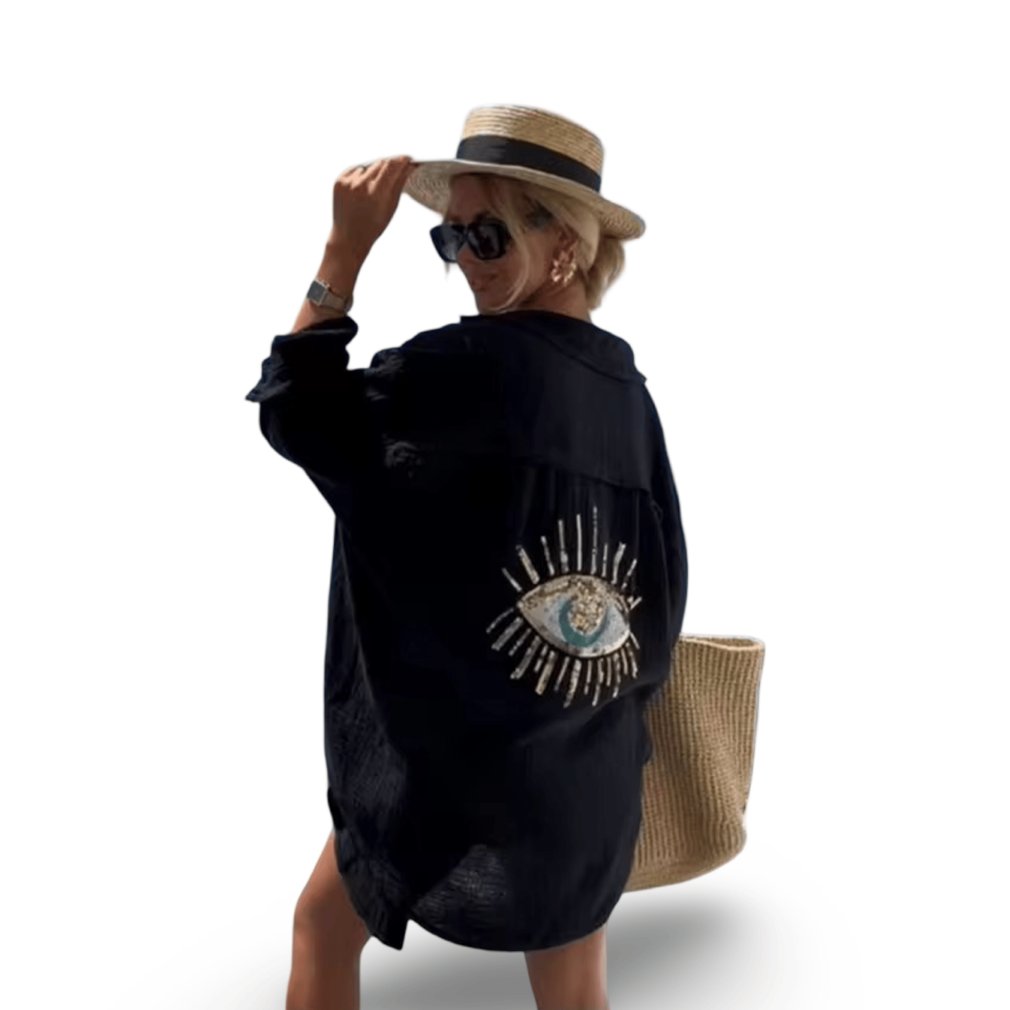 Effortlessly transition from the beach to the boardwalk in the Mina Evil Eye Shirt. This stunning black shirt combines traditional craftsmanship with modern beach style, featuring a dazzling sequined evil eye on the back that offers both protection and elegance. This versatile piece is perfect for layering over your swimsuit or wearing as a casual summer cover-up. The sleek black fabric keeps you cool while providing stylish coverage, making it ideal for warm weather adventures from sunrise to sunset. The evil eye design isn't just beautiful—it carries centuries of tradition, believed to ward off negative energy and bring good fortune. The eye-catching sequined detail adds a touch of glamour to your beach ensemble. Pair with our Damascus Evil Eye Canvas Beach Bag or Cairo Evil Eye Canvas Beach Bag for a coordinated beach look.