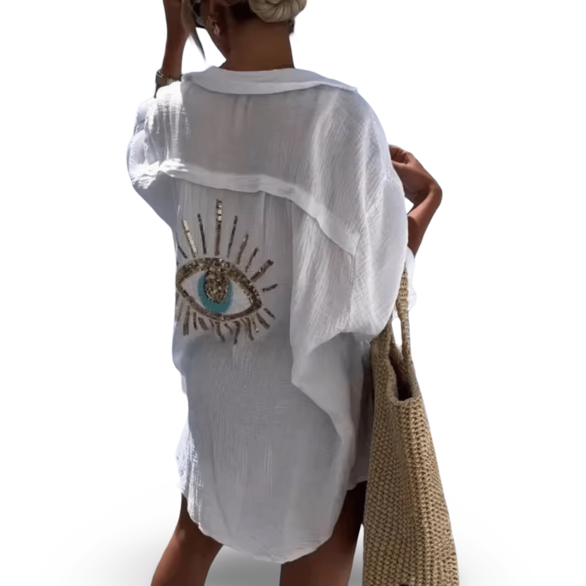 Effortlessly transition from the beach to the boardwalk in the Mina Evil Eye Shirt. This stunning white shirt combines traditional craftsmanship with modern beach style, featuring a dazzling sequined evil eye on the back that offers both protection and elegance. This versatile piece is perfect for layering over your swimsuit or wearing as a casual summer cover-up. The crisp white fabric keeps you cool while providing stylish coverage, making it ideal for warm weather adventures from sunrise to sunset. The evil eye design isn't just beautiful—it carries centuries of tradition, believed to ward off negative energy and bring good fortune. The eye-catching sequined detail adds a touch of glamour to your beach ensemble. Pair with our Damascus Evil Eye Canvas Beach Bag or Cairo Evil Eye Canvas Beach Bag for a coordinated beach look.