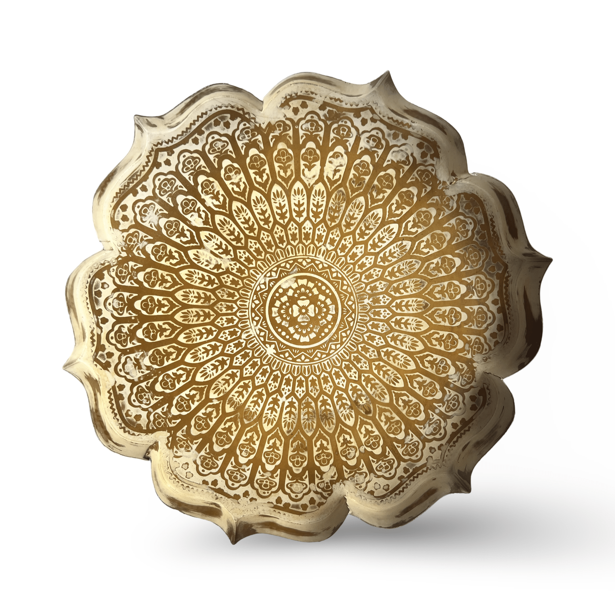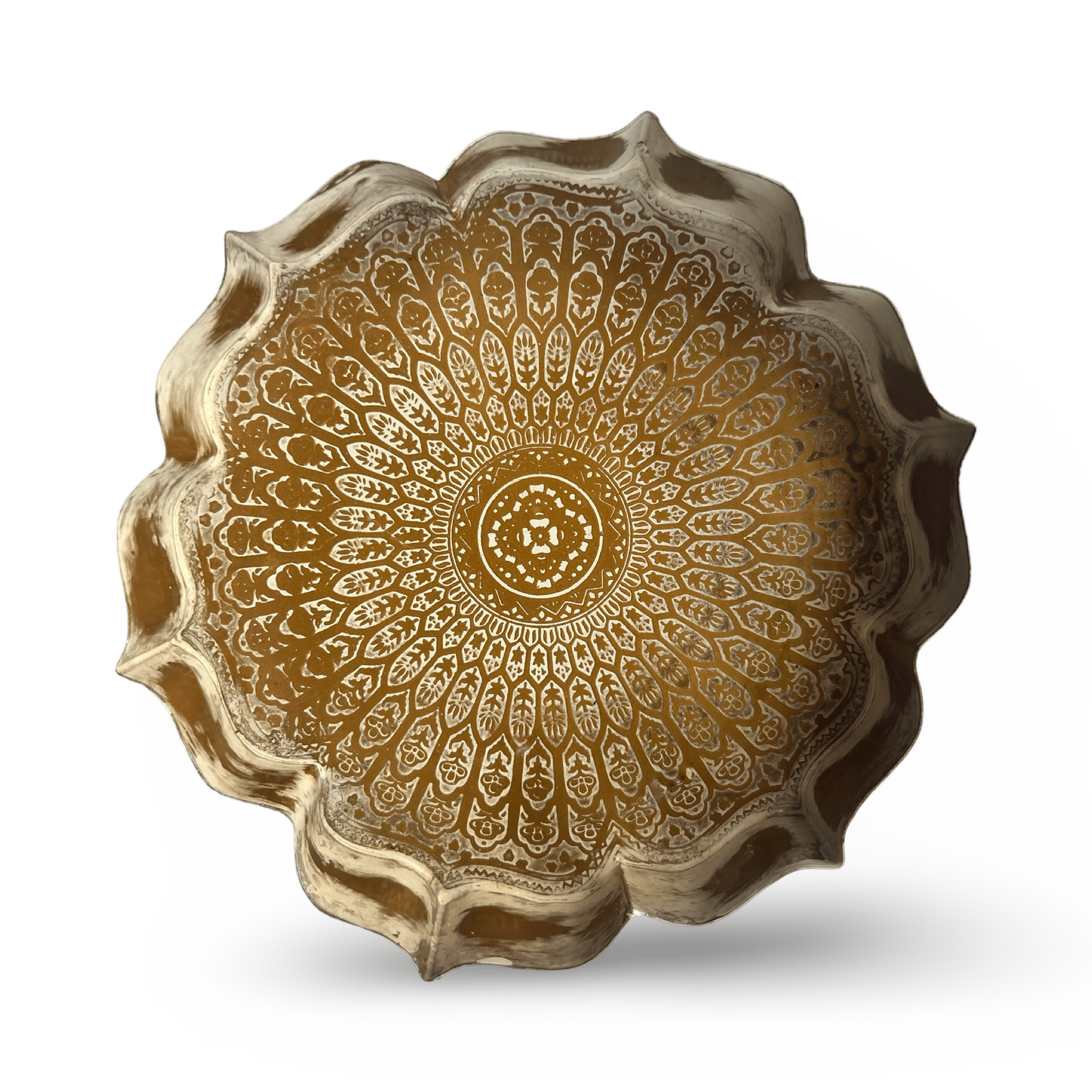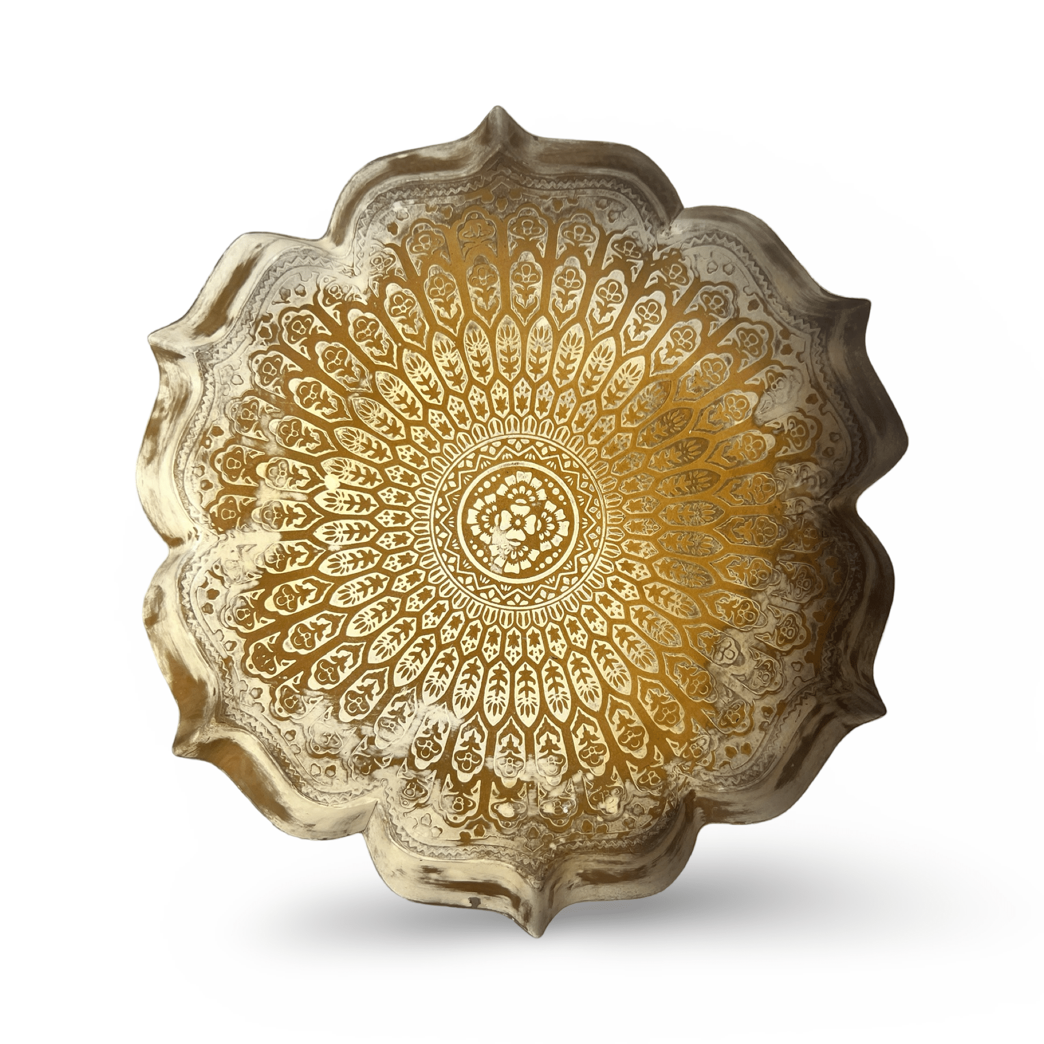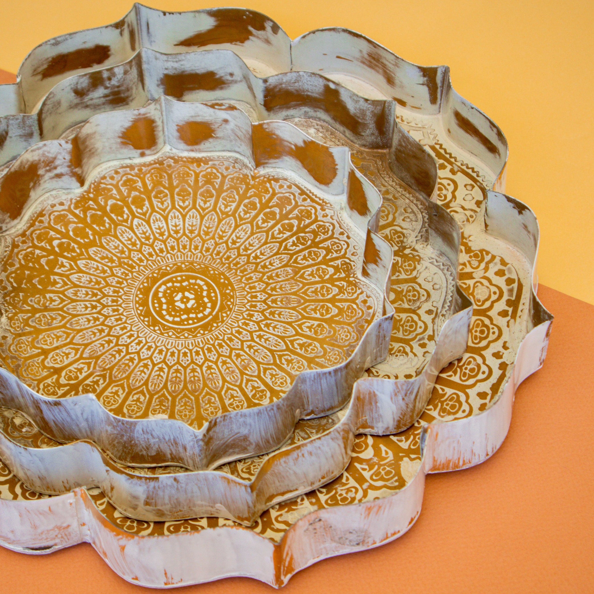 Handcrafted by skilled artisans in India, each Mumtaz Tray in this set of 3 showcases the timeless beauty of traditional metalwork. Artisans meticulously hand-hammer and finish each tray with an antique gold patina, creating intricate lotus-inspired designs that bring elegance to any space. Because each tray is individually handcrafted, slight variations in the hammering pattern and finish make every piece uniquely yours—no two trays are exactly alike. Perfect for serving, display, or as a stunning centerpiece, these trays bring artisanal luxury to your home.