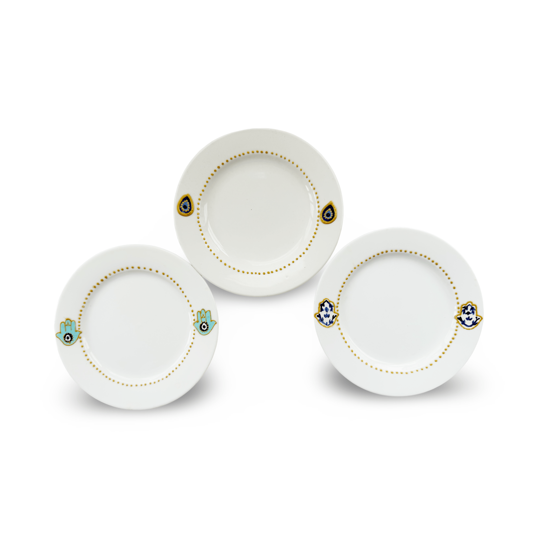 Elevate your table with the spiritual beauty of our Nadine Dessert Plates from Jordan. This set of 6 features elegant off-white porcelain adorned with hand-painted evil eye and hamsa designs in blue and gold accents, creating a meaningful yet sophisticated aesthetic. Each plate tells its own story, adding a touch of elegance and spiritual significance to any occasion. Whether you're hosting a dinner party or simply enjoying a sweet treat, these plates create an enchanting atmosphere that sparks conversation and appreciation for artistry. Perfectly complemented by our Ruva Dessert Forks (set of 4), these plates elevate your dining experience with whimsy and charm. Perfect for everyday use or special occasions.