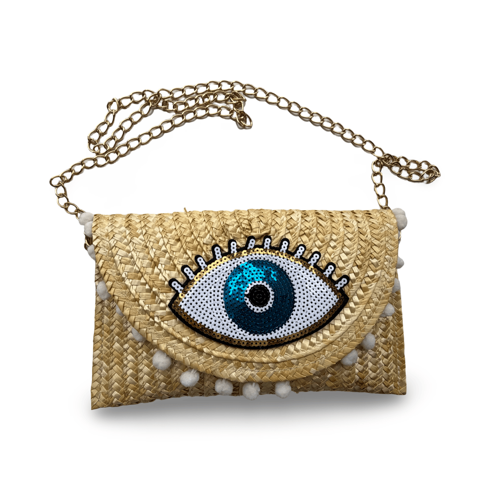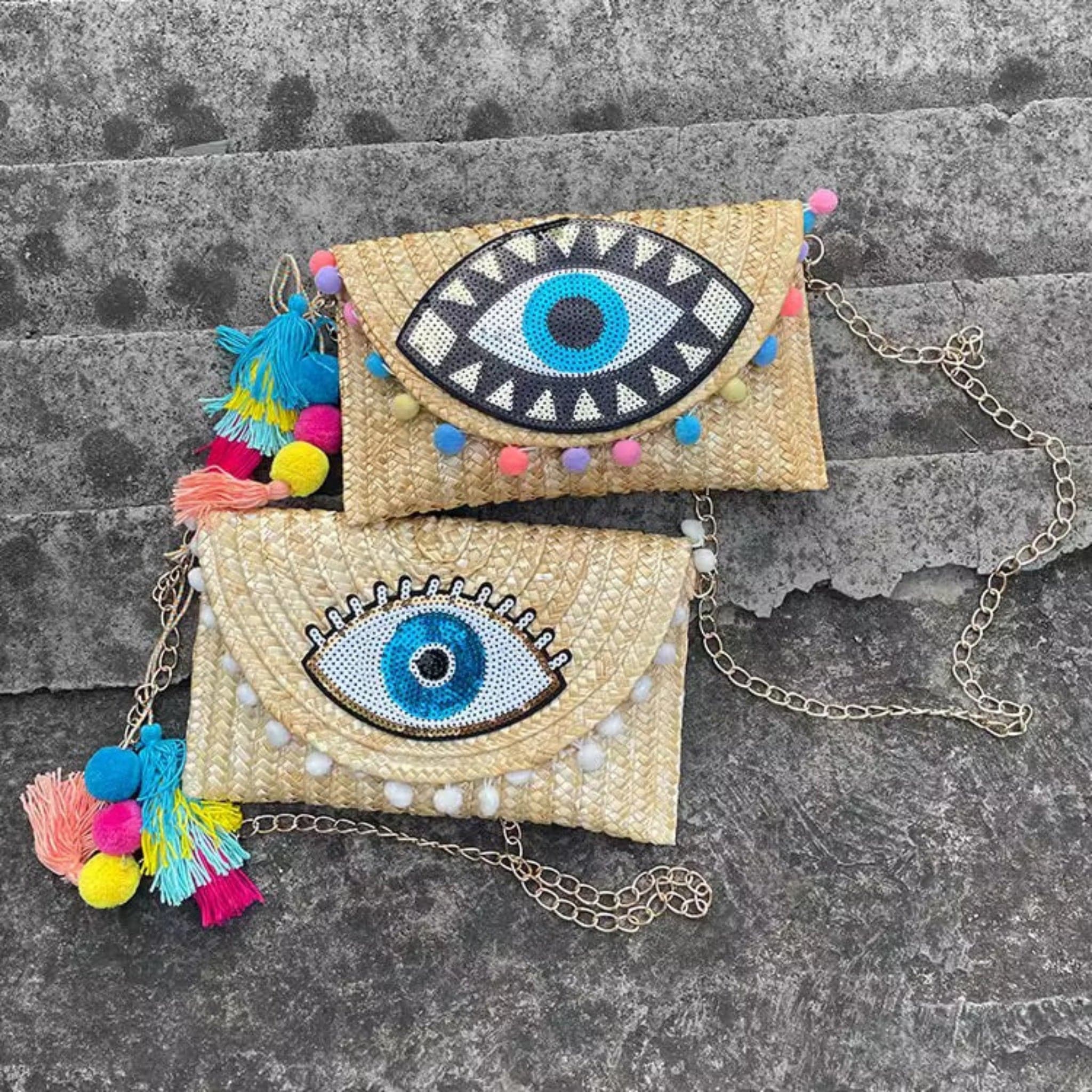 Discover the perfect blend of bohemian charm and artisan excellence with the Naomi Clutch, where hand-applied sequins create a mesmerizing evil eye design on natural beige straw. This isn't just an accessory—it's a conversation piece that carries centuries of cultural heritage and protective symbolism. Artisans dedicate hours to carefully placing each sequin, creating a distinctive pattern that shimmers and shifts with every movement, ensuring you'll turn heads wherever you go. The warm beige tones and playful tassel accents make Naomi the ideal companion for the woman who loves mixing textures, layering accessories, and creating looks that feel authentically her own.