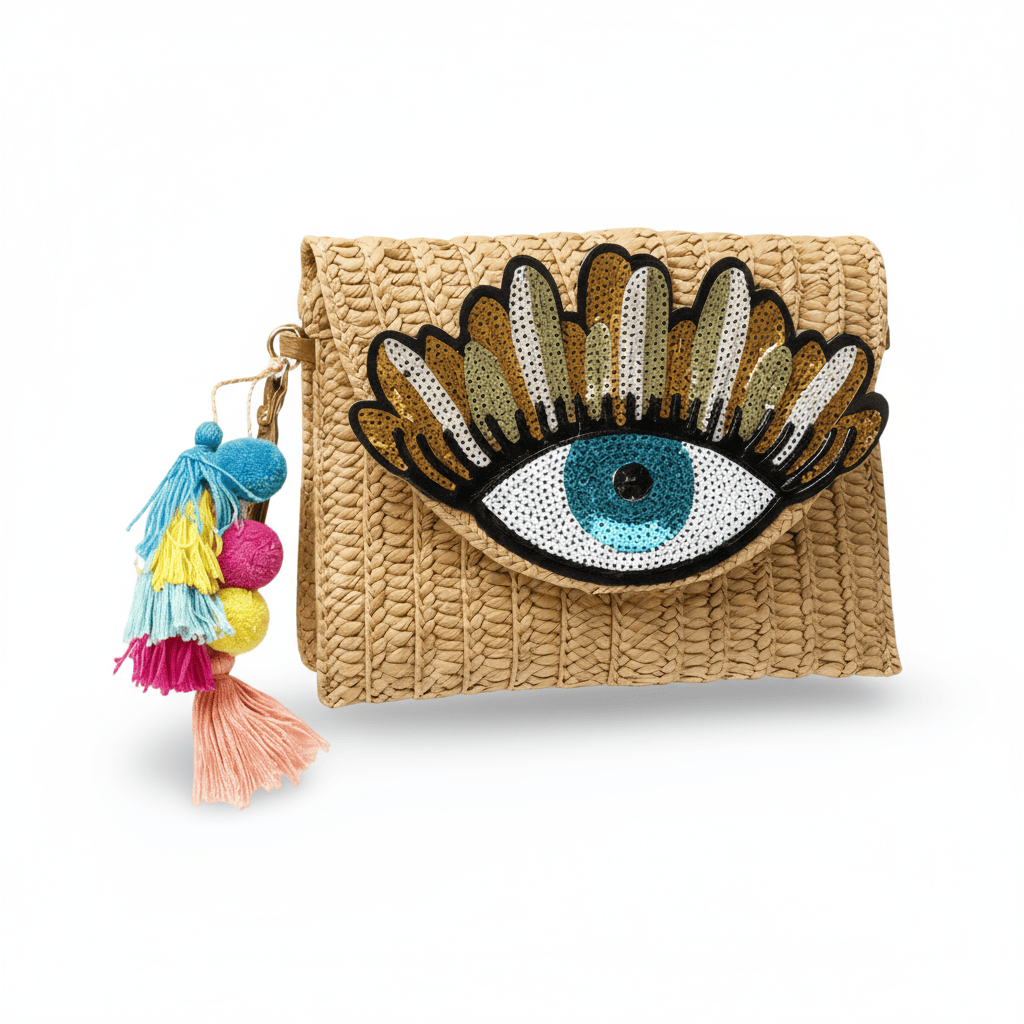 Pack your wanderlust with the Ruth Clutch, named for adventurers and travelers who carry protection wherever they roam. Artisans weave durable straw foundations before applying sequins in the evil eye pattern—originally carried by Silk Road merchants to safeguard their journeys across continents and through unfamiliar territories. Colorful tassels catch the eye in crowded souks, seaside cafés, and cobblestone markets, adding movement and personality to your travel style.