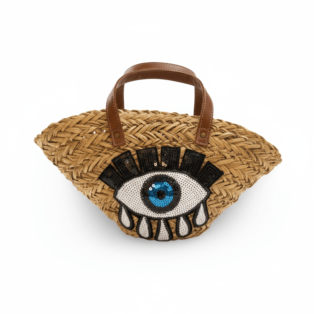 Meet your new everyday companion with the Sarah Evil Eye Beach Bag, striking the perfect balance between bohemian charm and practical versatility. The distinctive brown straps add earthy contrast to beige straw and sparkling sequins, creating a grounded aesthetic that transitions effortlessly from sandy shores to city streets, farmers markets to casual brunches.