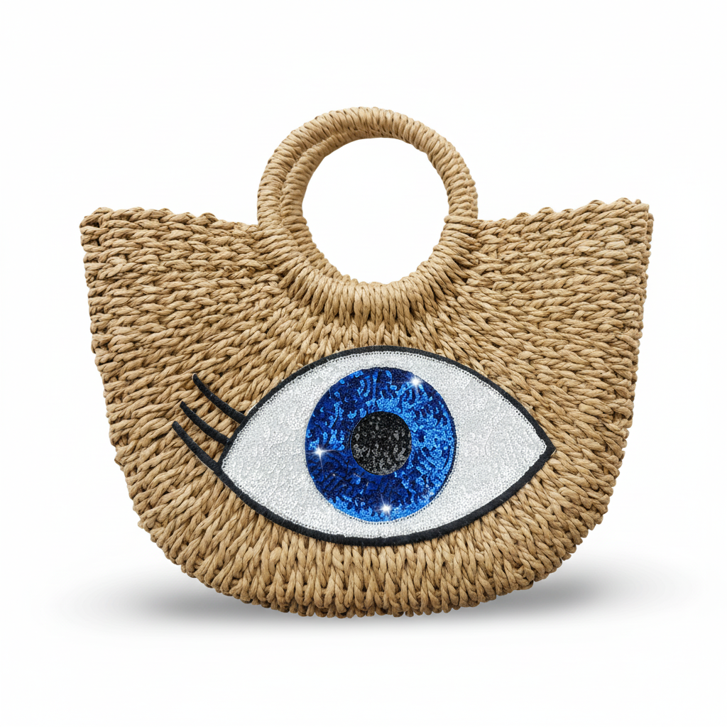 Bring vibrant coastal energy to every celebration with the Talia Evil Eye Beach Bag, designed for those who live for summer festivals, beach parties, and sun-soaked gatherings where your accessories are part of the experience. Woven from natural straw and adorned with dazzling sequins that form the mesmerizing evil eye design, Talia embodies the spirit of Mediterranean celebrations.