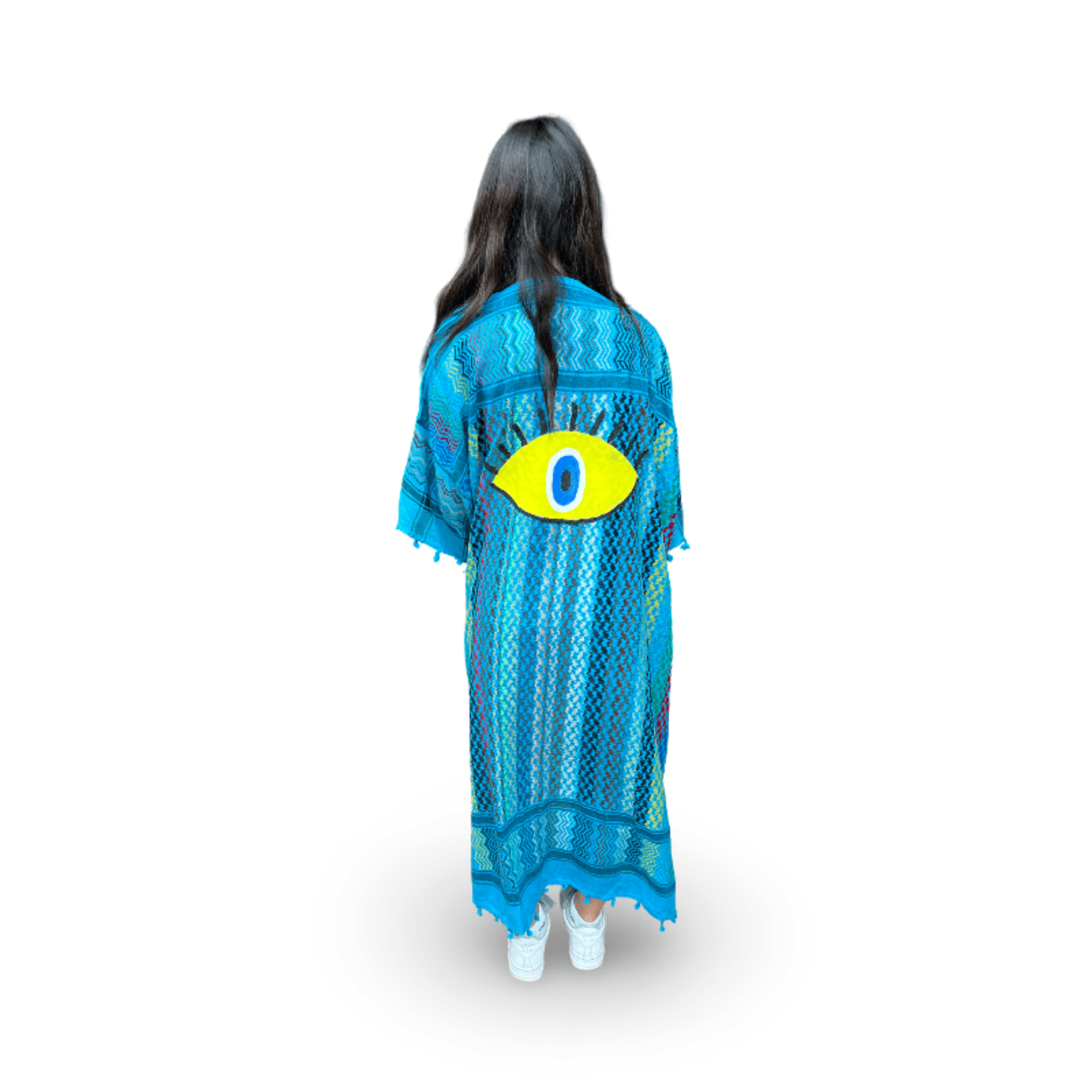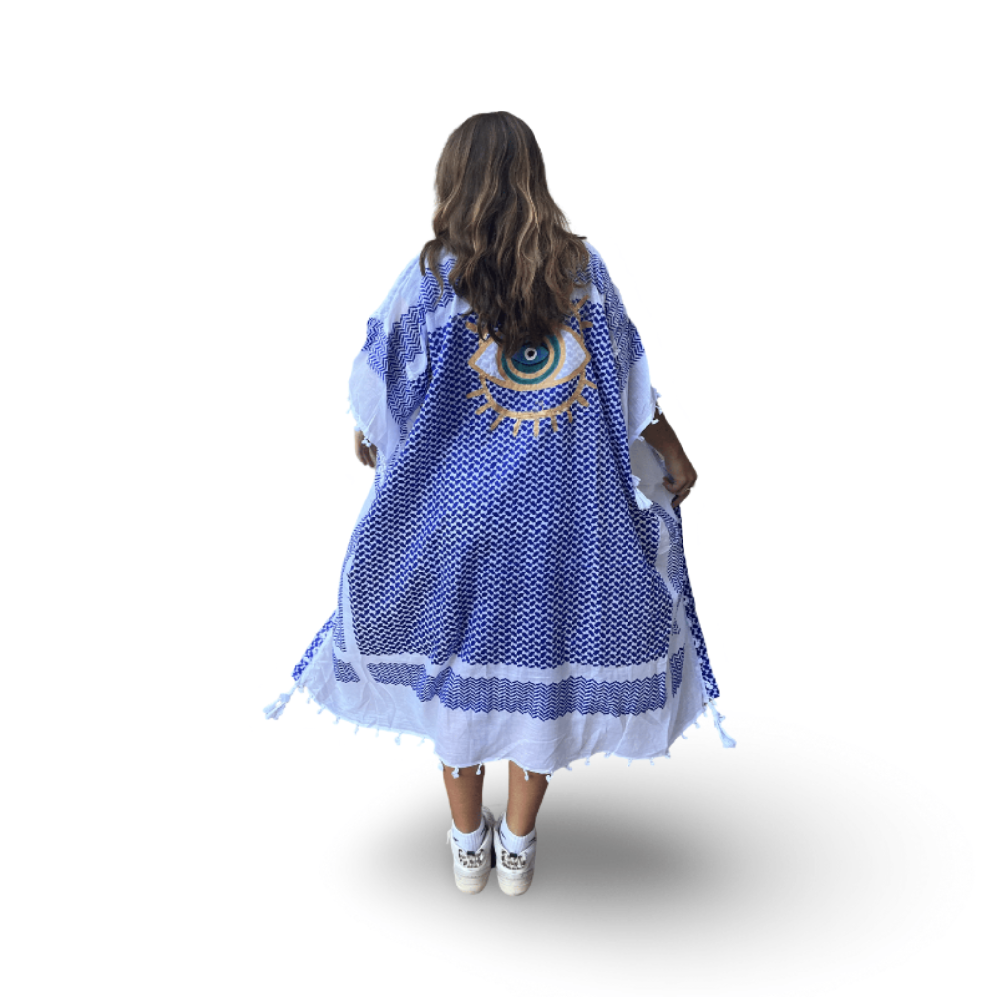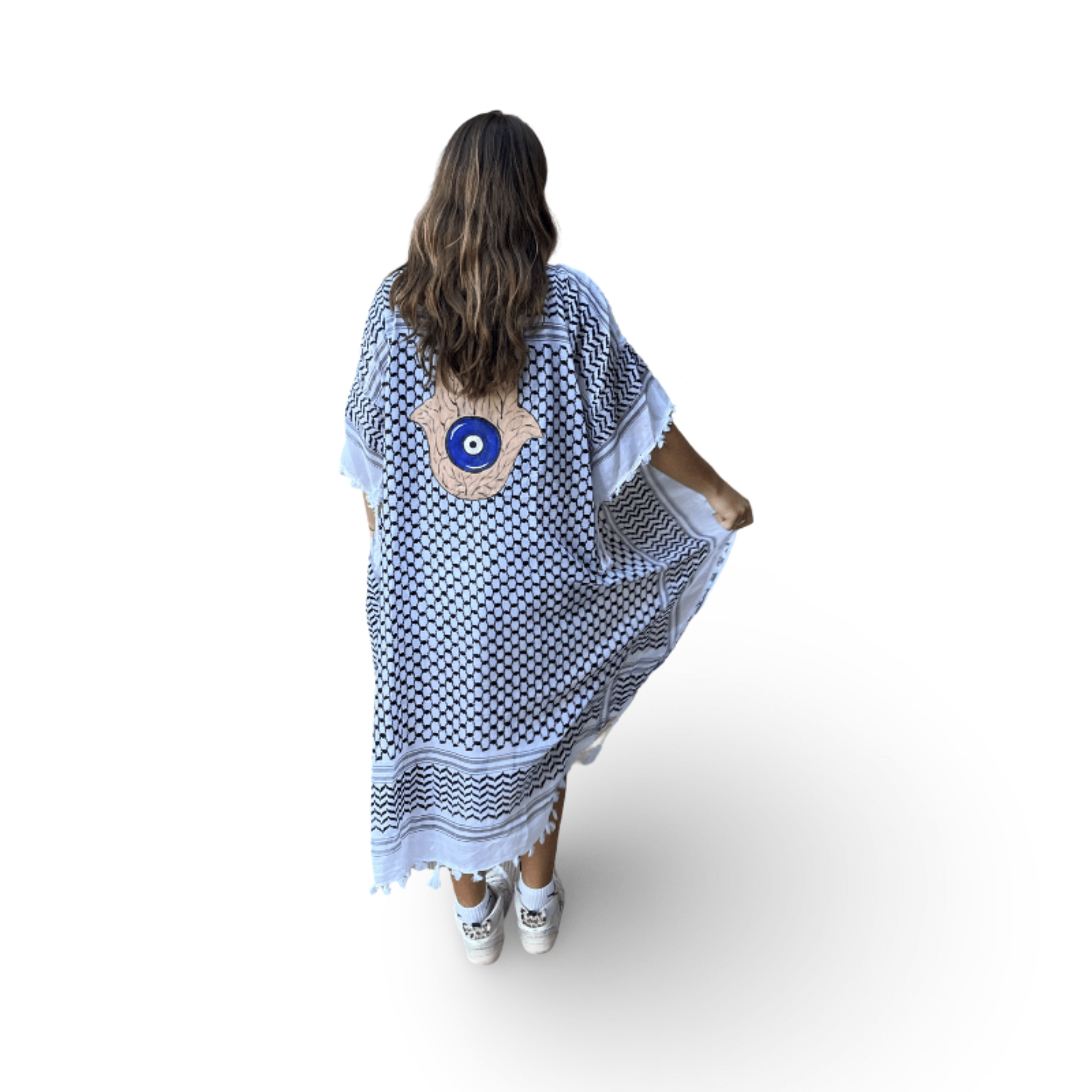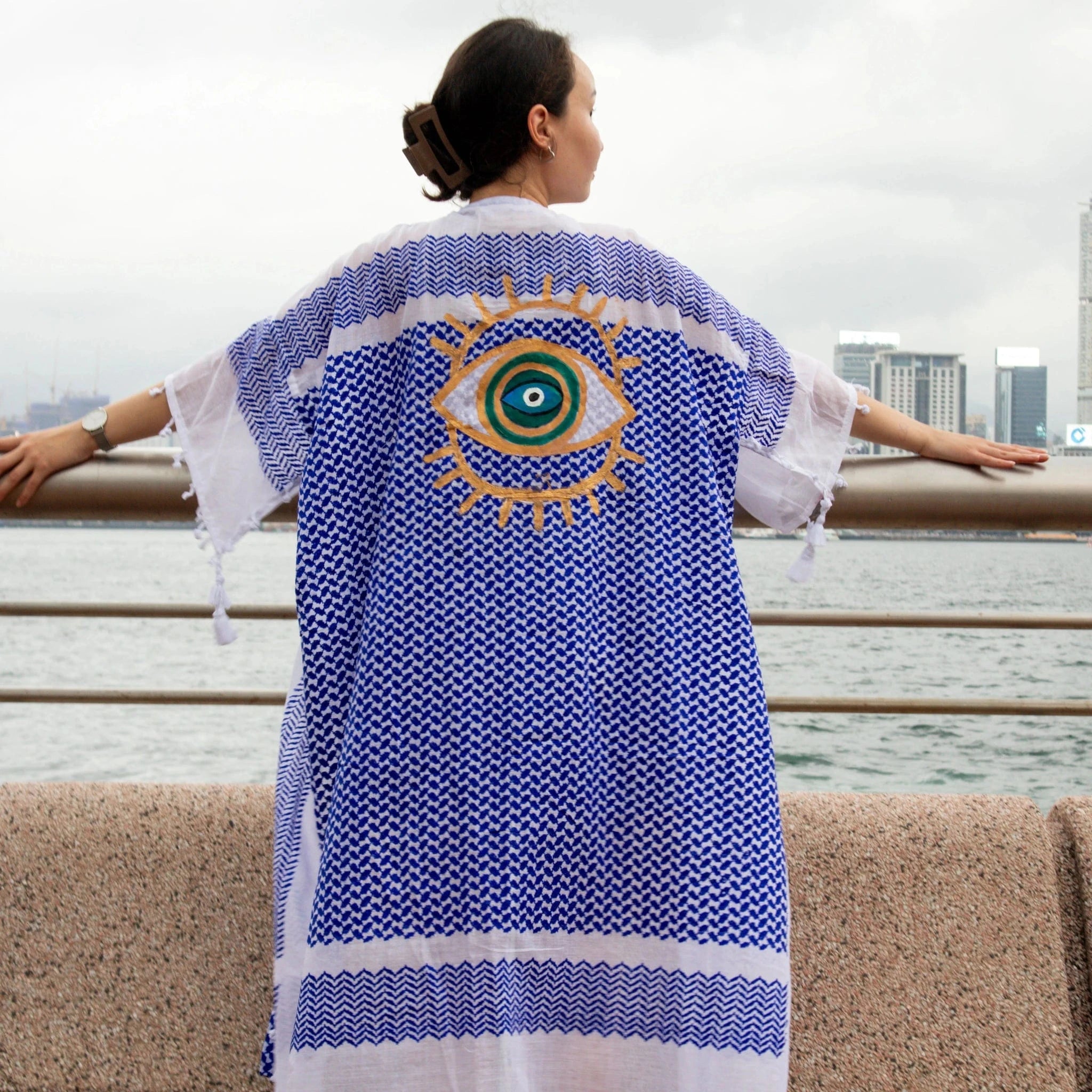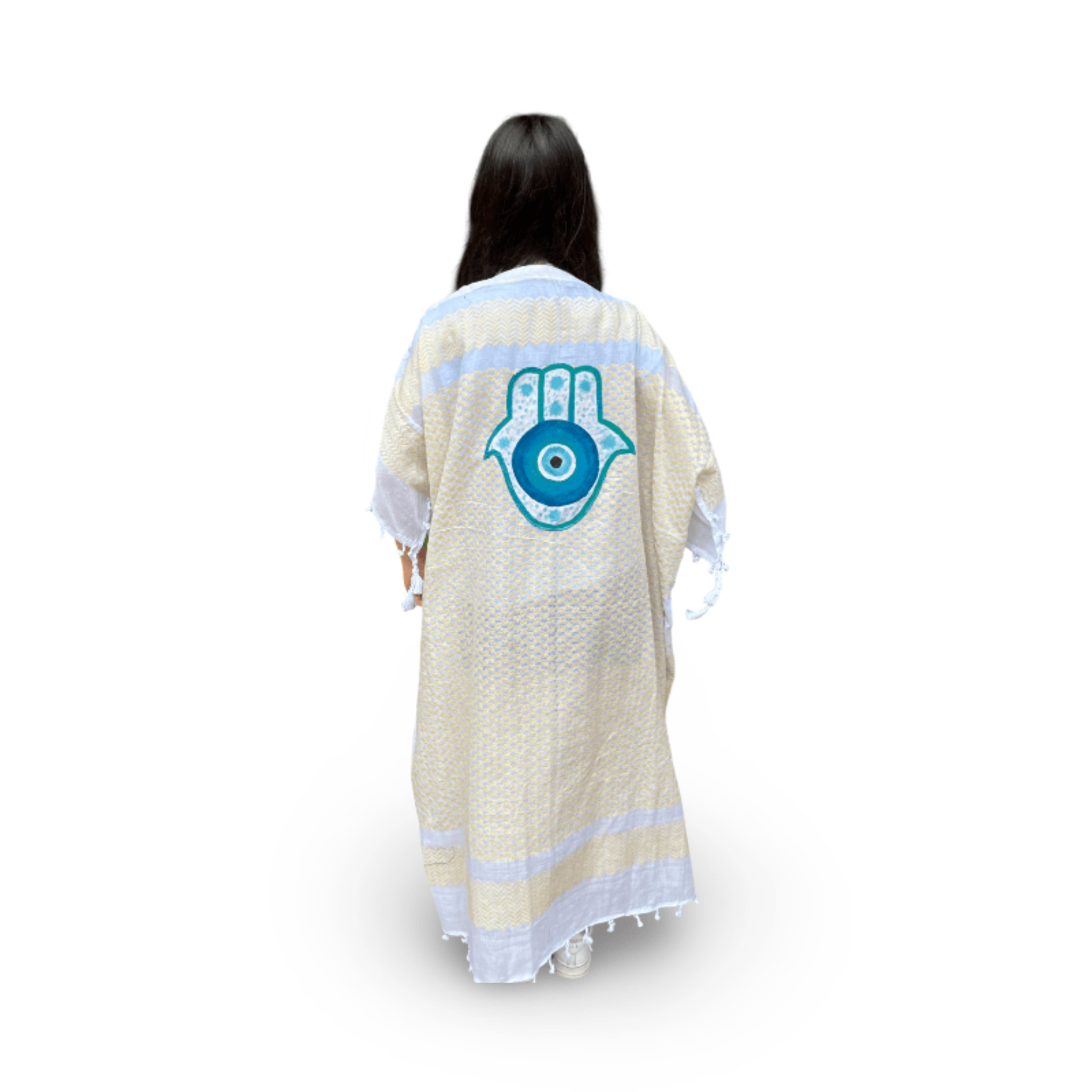 Skilled textile artisans in Lebanon create each Tyre Kaftan from high-quality traditional Guthra cotton fabric, hand-painting beautiful motifs ranging from evil eyes and hamsas to butterflies and sunflowers. The lightweight and breathable material offers perfect comfort for hot summer days, while artisans carefully create each piece with meticulous attention to detail. Whether you wear it as a beach cover-up, poolside loungewear, or a stylish layer at home, this beautiful kaftan keeps you cool and effortlessly chic. The premium fabric ensures you stay comfortable from sunrise to sunset, bringing authentic Lebanese craftsmanship and artisan character to your summer wardrobe. Perfect for beach vacations, resort getaways, poolside relaxation, or as a thoughtful gift for travelers and anyone who appreciates resort wear with cultural artistry. An ideal addition to your Hong Kong summer wardrobe or vacation essentials. Opt for our Mina Evil Eye Shirt for an alternate look.