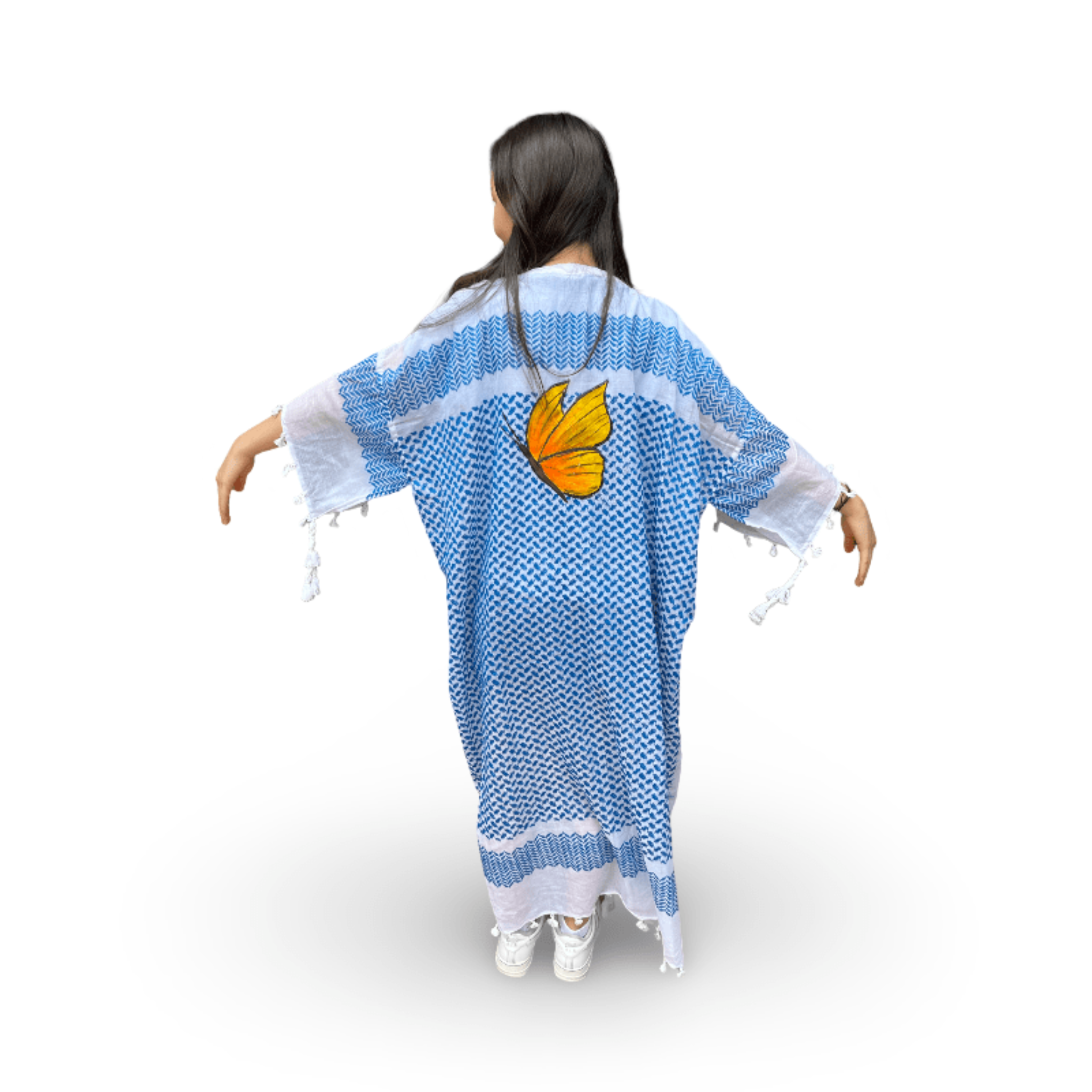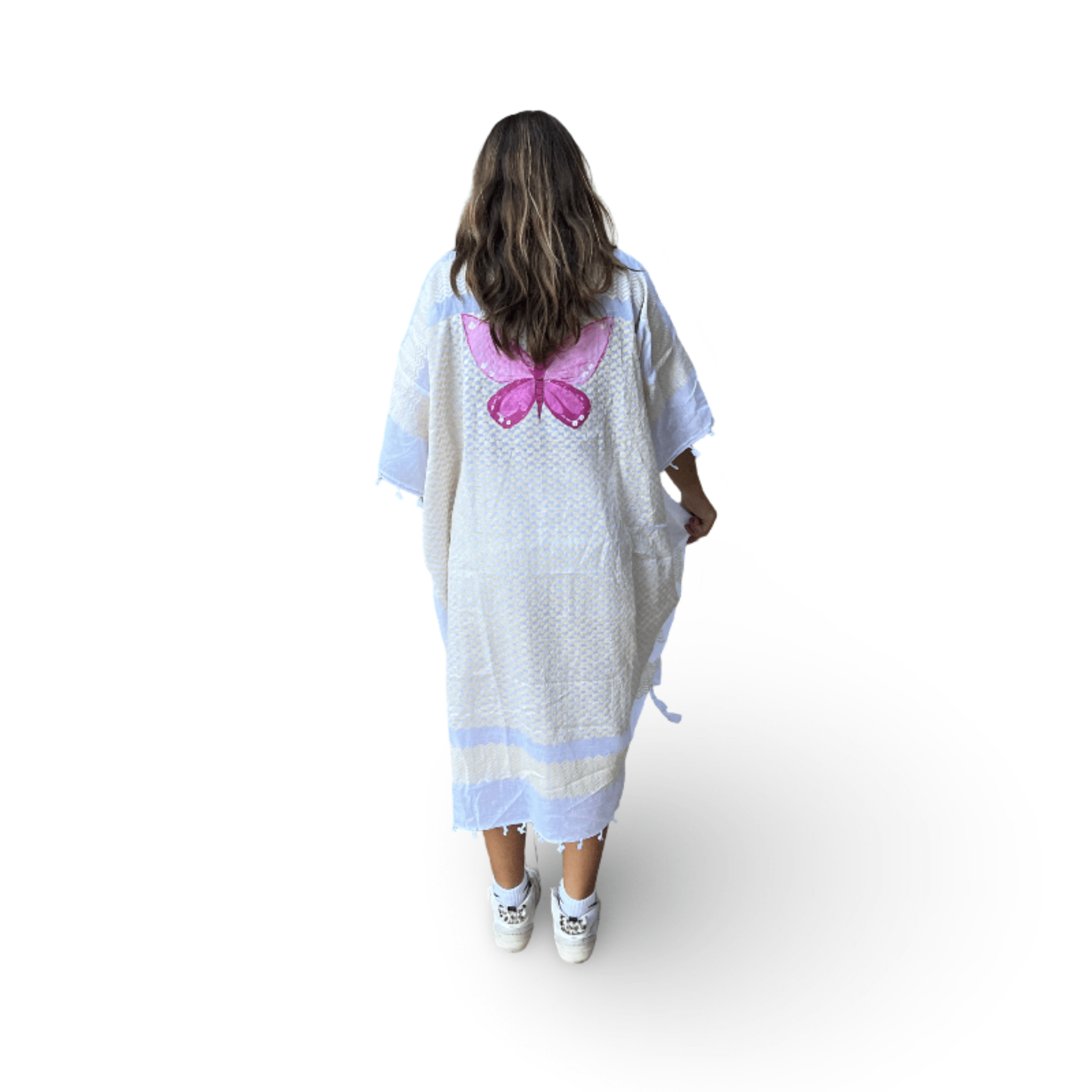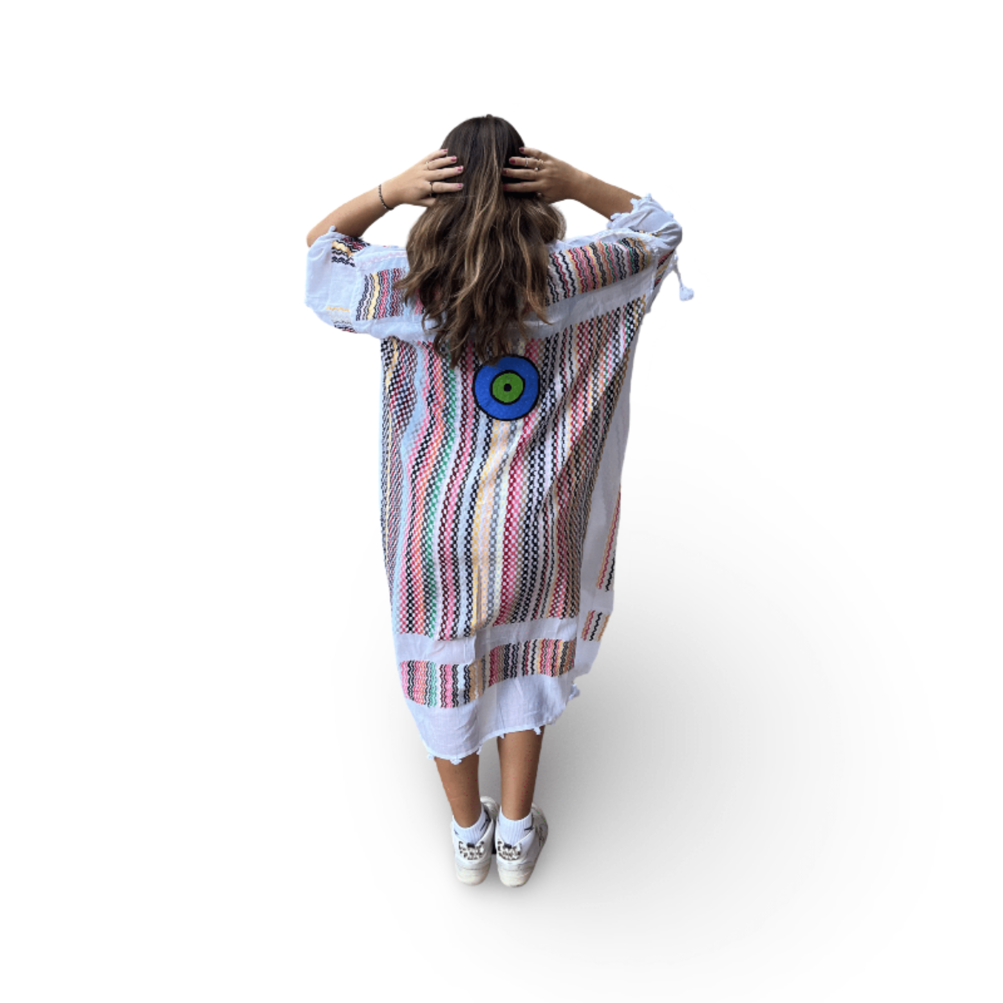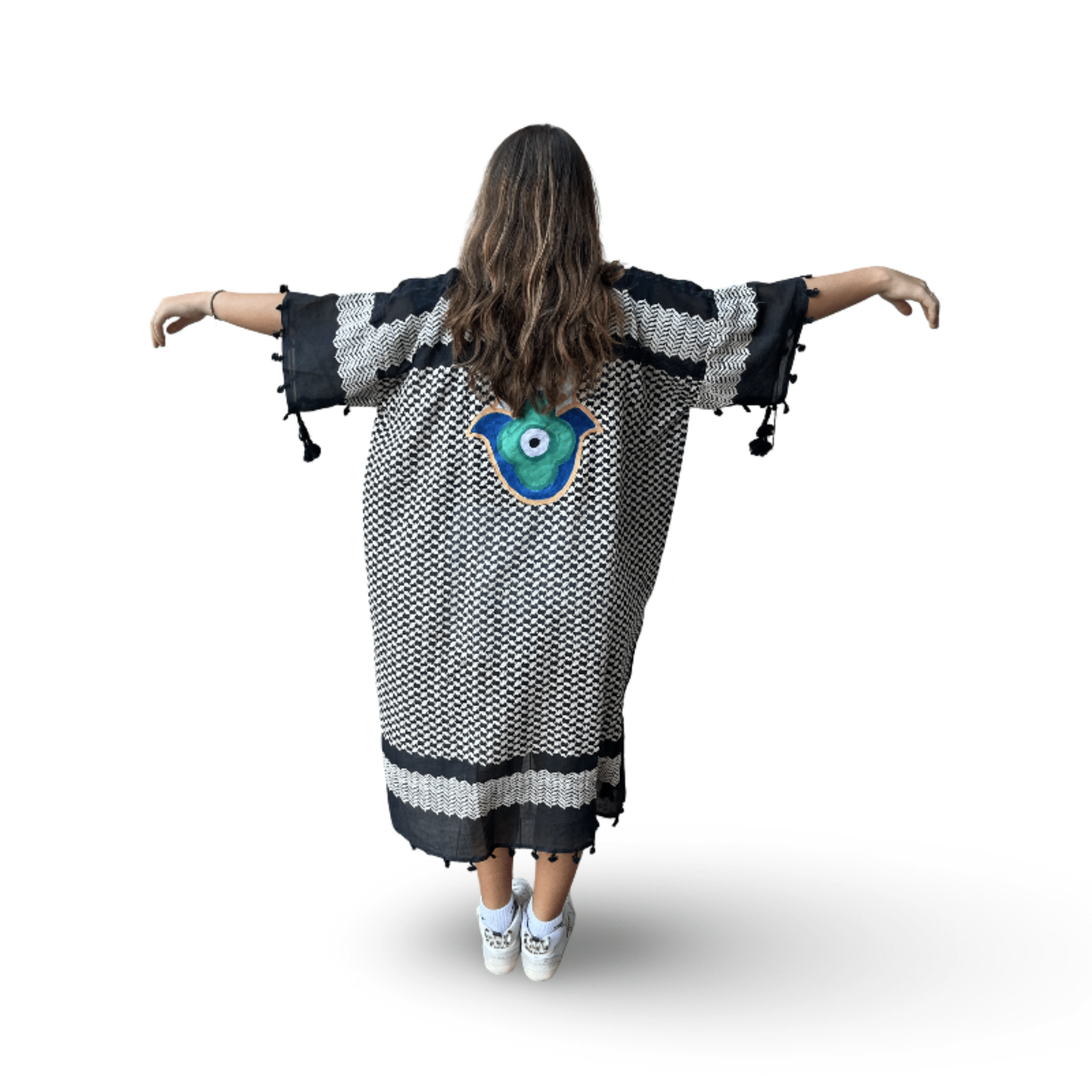 Skilled textile artisans in Lebanon create each Tyre Kaftan from high-quality traditional Guthra cotton fabric, hand-painting beautiful motifs ranging from evil eyes and hamsas to butterflies and sunflowers. The lightweight and breathable material offers perfect comfort for hot summer days, while artisans carefully create each piece with meticulous attention to detail. Whether you wear it as a beach cover-up, poolside loungewear, or a stylish layer at home, this beautiful kaftan keeps you cool and effortlessly chic. The premium fabric ensures you stay comfortable from sunrise to sunset, bringing authentic Lebanese craftsmanship and artisan character to your summer wardrobe. Perfect for beach vacations, resort getaways, poolside relaxation, or as a thoughtful gift for travelers and anyone who appreciates resort wear with cultural artistry. An ideal addition to your Hong Kong summer wardrobe or vacation essentials. Opt for our Mina Evil Eye Shirt for an alternate look.