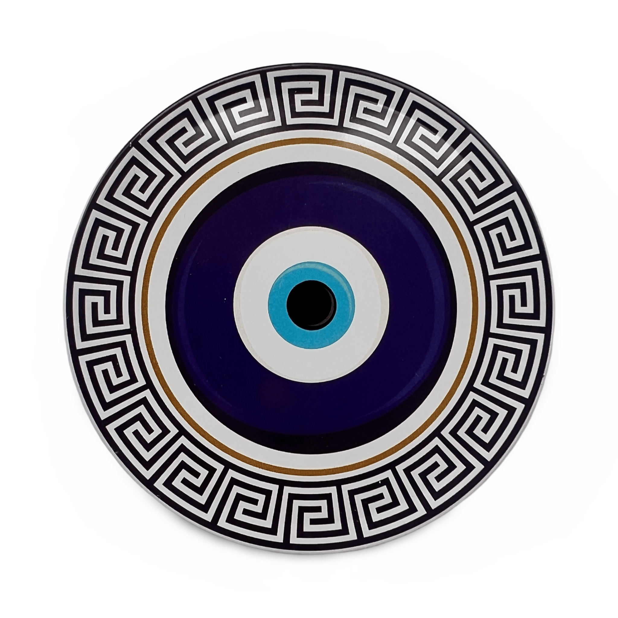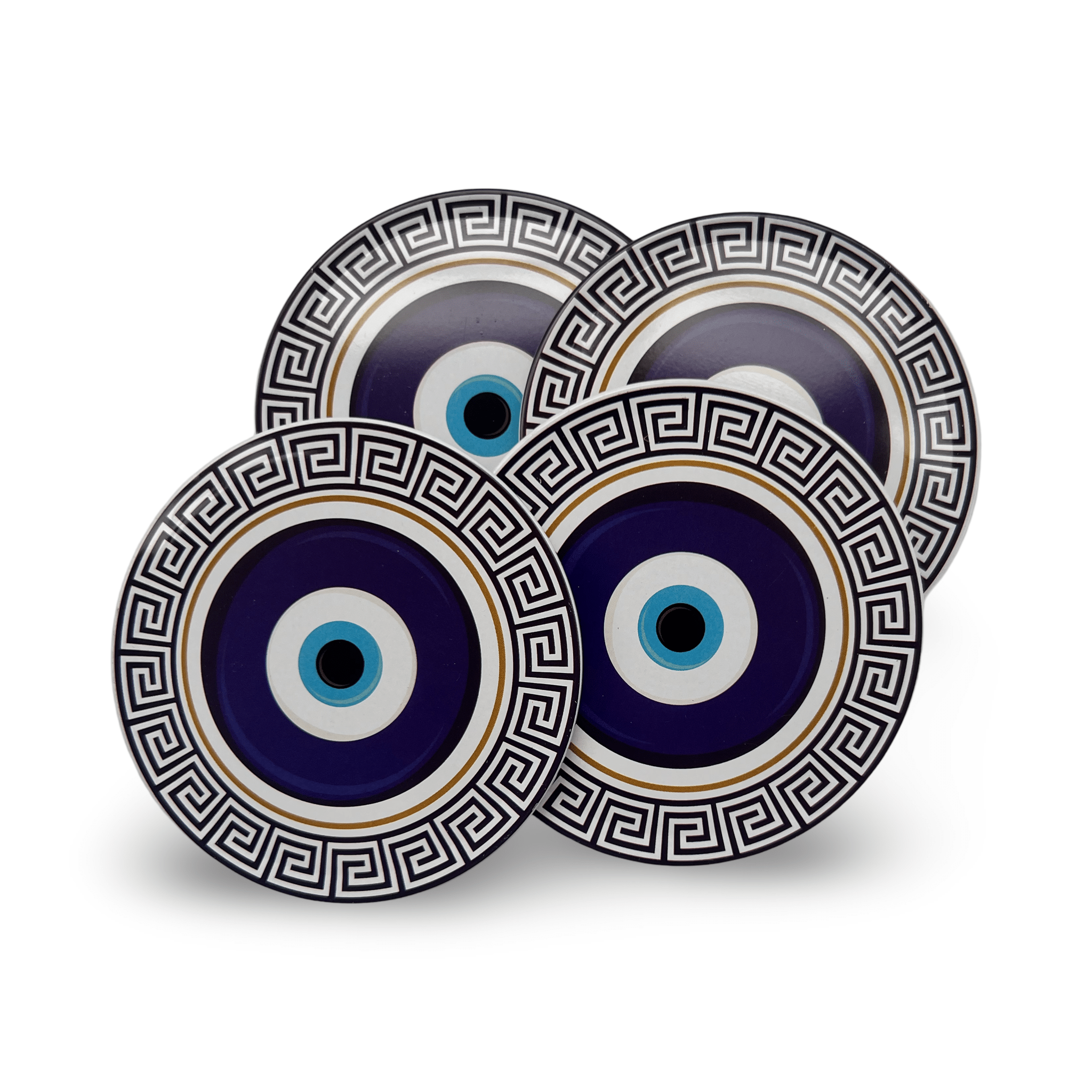 Picture your table adorned with these four elegant guardians, each one displaying the intricate geometric evil eye design while warding off envious glances with the powerful protective motif. The white and blue design makes them incredibly versatile—they complement any décor style while adding that distinctive touch of Mediterranean mystique. The set of four represents completeness and harmony, perfect for families and friends who gather around your table. The lightweight aluminum construction with cork backing provides durable protection for your surfaces.
