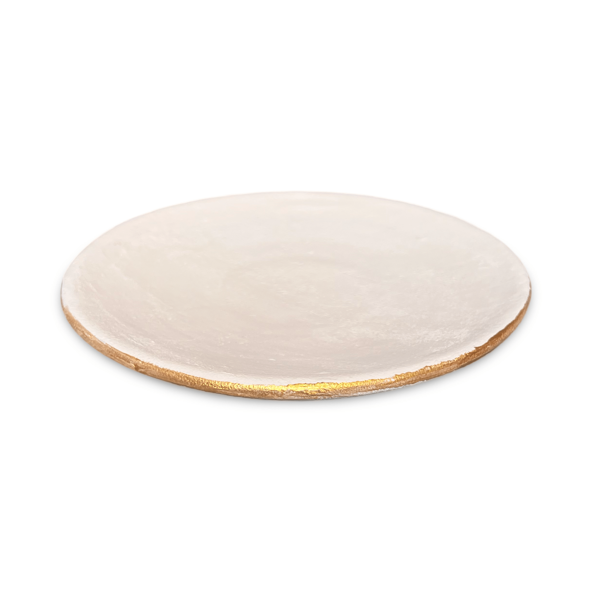 Hand-painted by skilled ceramic artisans in Egypt, this White Ceramic Candle Plate showcases the delicate artistry of traditional Middle Eastern craftsmanship. Each plate is individually handcrafted, with artisans carefully applying the luxurious gold border by hand using techniques passed down through generations. The pristine white ceramic provides the perfect canvas for the gleaming gold accent, creating an elegant piece that elevates any space. Because each plate is hand-painted, every piece is unique with natural variations in the gold border's width and placement—signatures of authentic artisan work. Ideal for holding candles, it can also display small plants, trinkets, or seasonal decorations.