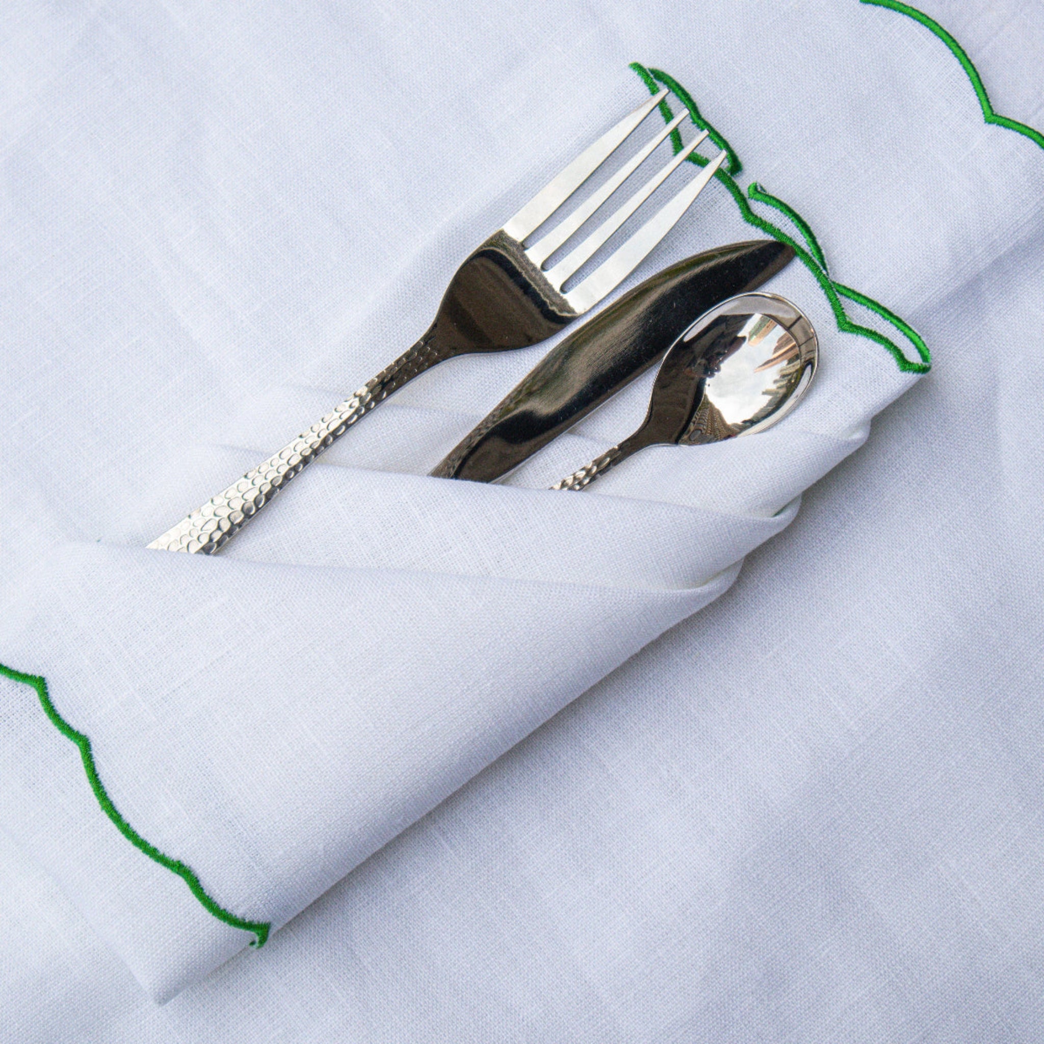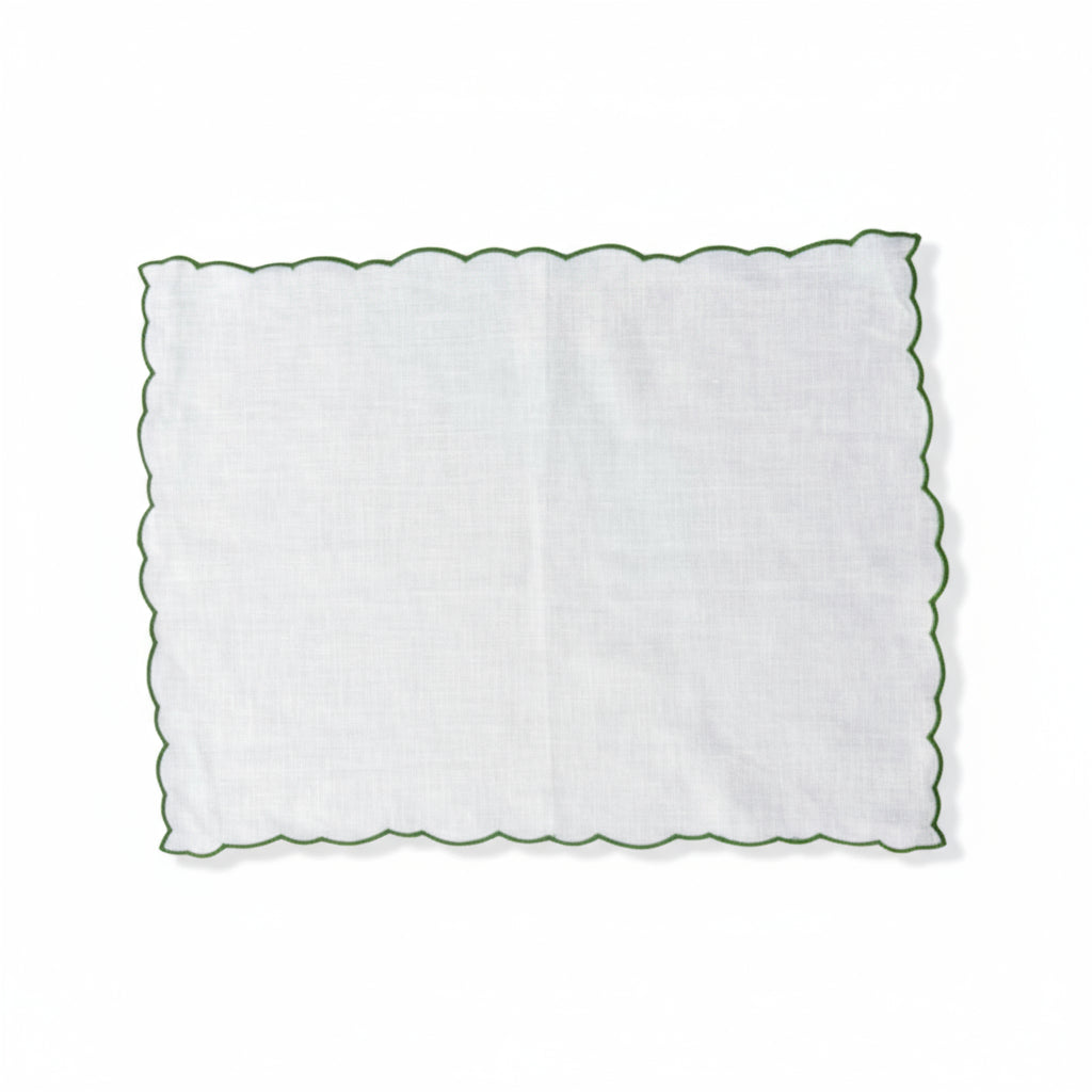 Vietnamese artisans create each placemat through careful handwork, cutting and finishing premium linen with distinctive scalloped edges trimmed in fresh green. The crisp white linen provides a clean, sophisticated foundation for any table setting, while the playful scalloped border and vibrant green trim add personality and visual interest. The natural linen texture brings organic warmth to formal and casual dining alike.
