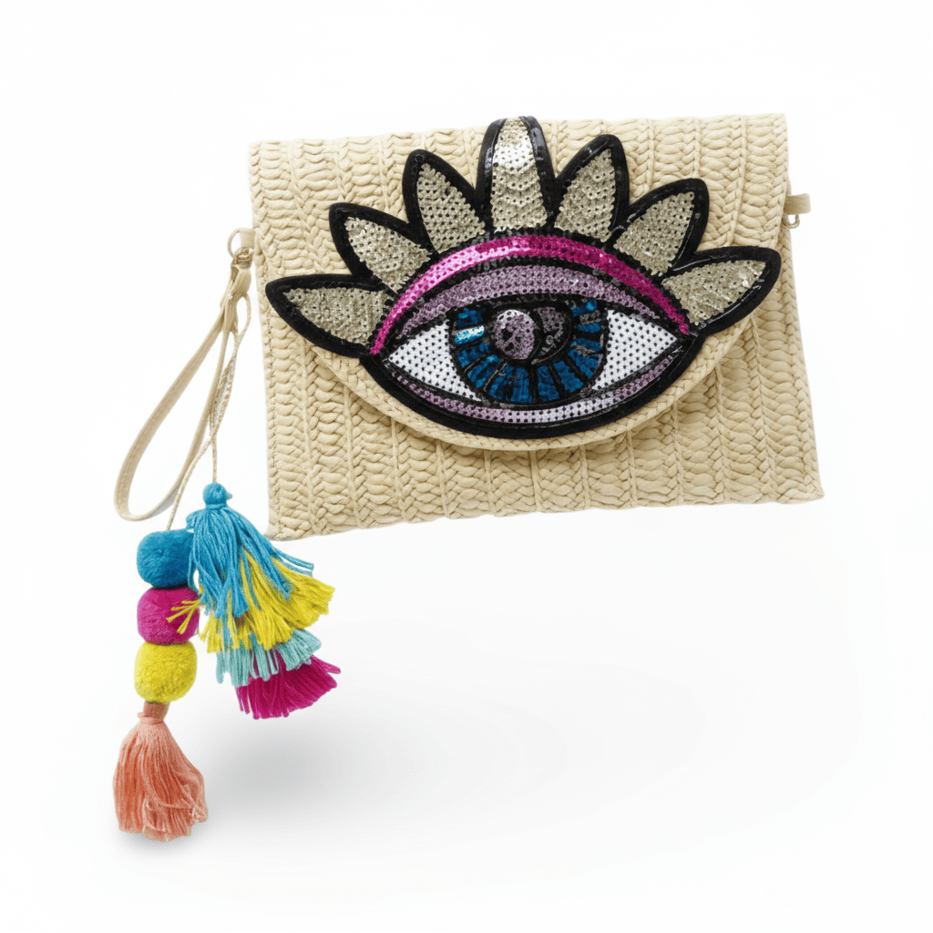 Elevate your most elegant moments with the Yael Clutch, where understated luxury meets timeless protection. The off-white palette delivers sophisticated neutrality while hundreds of sequins create a shimmering evil eye talisman—believed to attract good fortune and deflect envy across Mediterranean and Middle Eastern cultures for millennia. Delicate tassels provide just enough movement to keep things interesting without overwhelming your outfit, adding a subtle bohemian touch to refined ensembles.