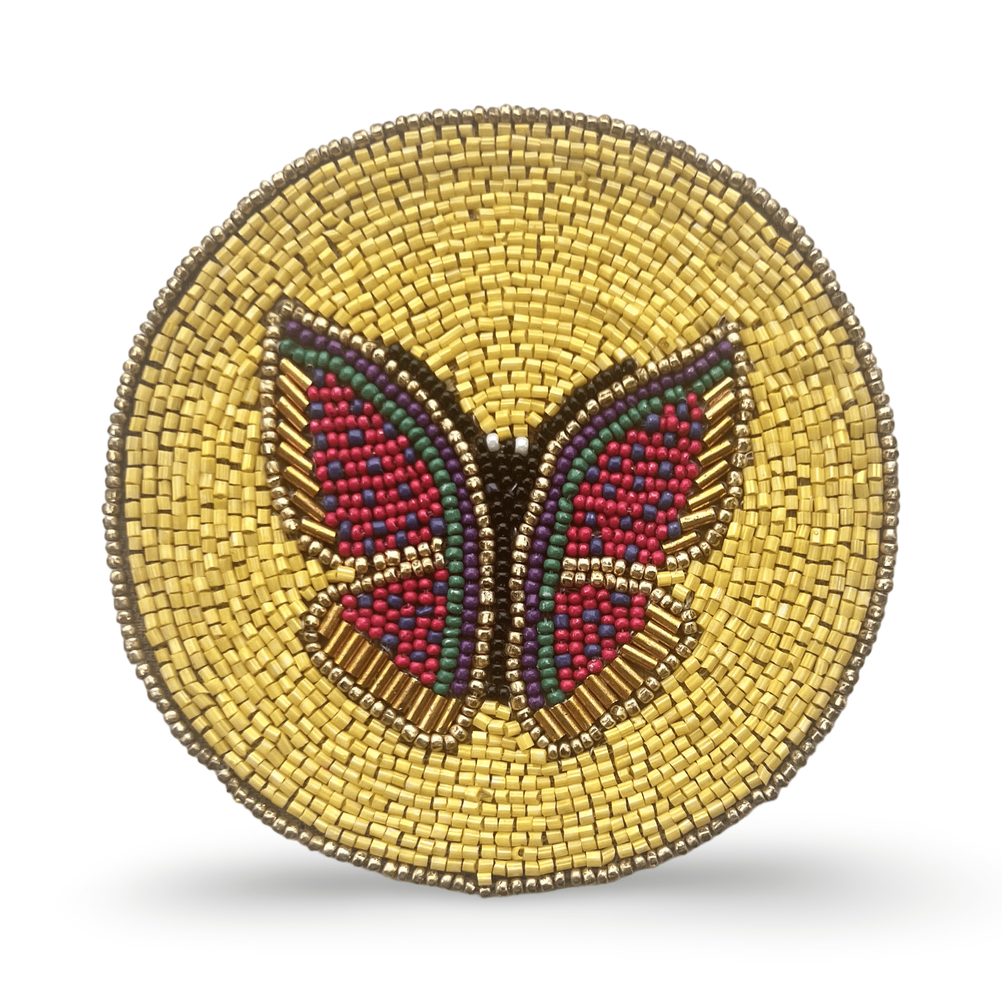 The Yellow Butterfly Coaster captures delicate garden beauty and transformation symbolism through intricate Indian beadwork. Artisans meticulously place and stitch...