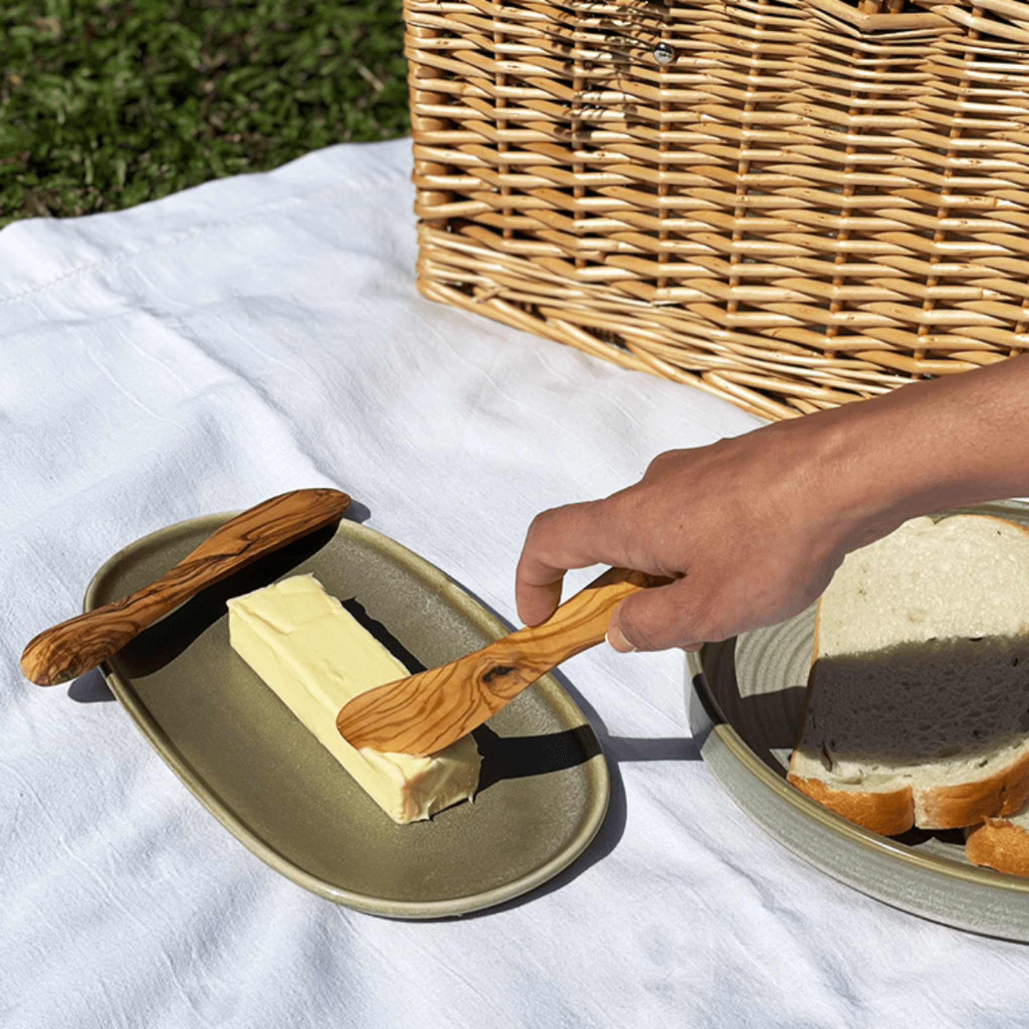 Skilled woodworkers in Tunisia create this Zaytun Butter Knife, bringing natural elegance and Middle Eastern charm to your table. Artisans carefully select smooth olive wood, then meticulously hand-carve each piece with Tunisian-inspired design, drawing from generations of woodworking expertise. Because each knife is individually hand-carved from this beautiful natural material, the grain patterns and warm tones vary beautifully, making every piece uniquely yours—no two knives are exactly alike. This versatile piece effortlessly spreads soft butter on warm bread without scraping, enhancing every bite with the beauty of Tunisian craftsmanship. The smooth surface feels warm and natural in your hand while the thoughtful design makes spreading a pleasure. Whether you're hosting brunch gatherings, enjoying family dinners, or creating beautiful cheese boards, this elegant knife adds authentic artisan character to your table.